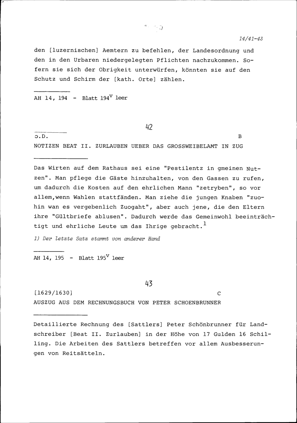 Notiz von Beat II. Zurlauben über das Grossweibelamt in Zug