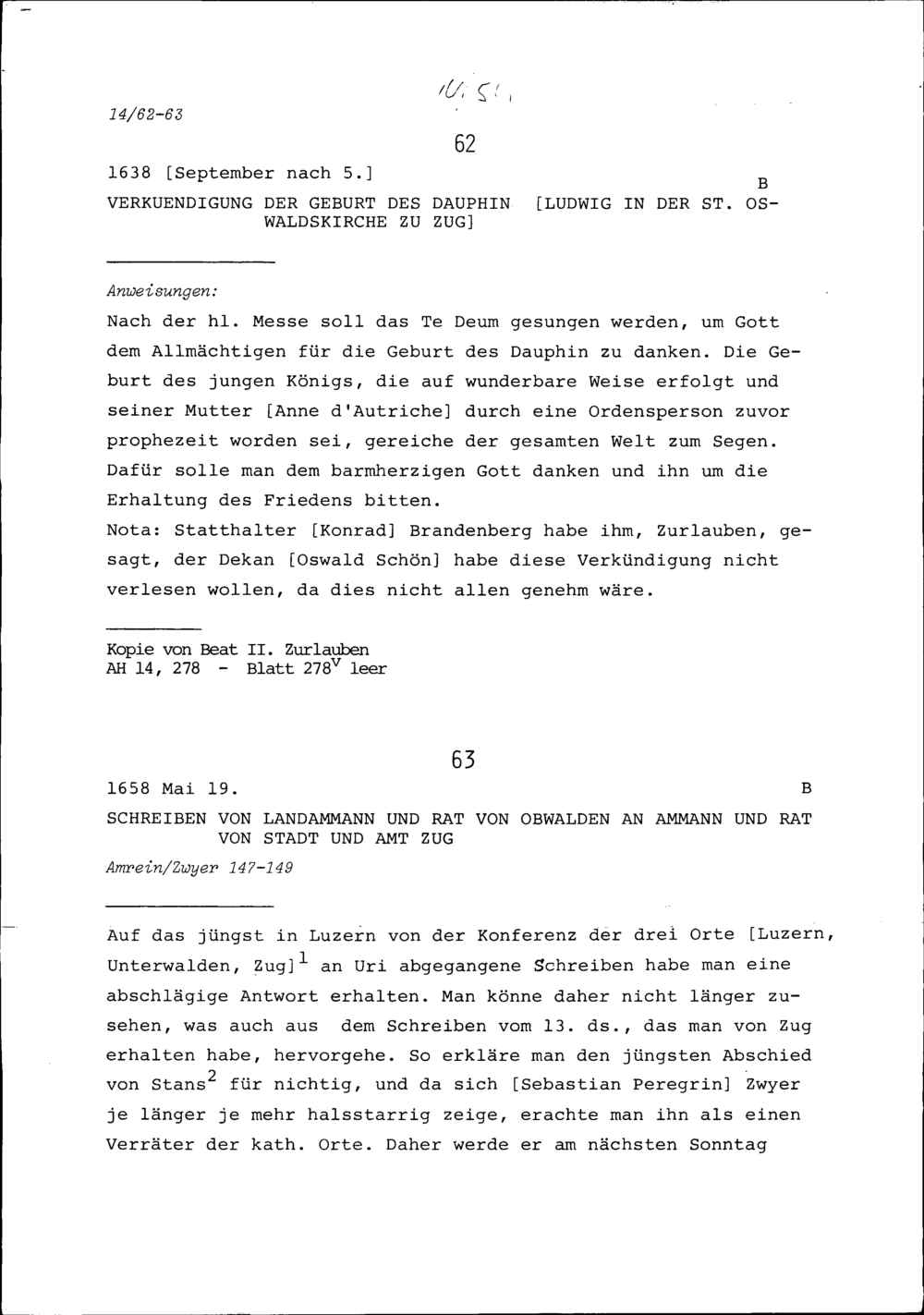 Verkündigung der Geburt von Dauphin Ludwig (späterer Ludwig XIV., König von Frankreich) in der Sankt Oswaldskirche zu Zug