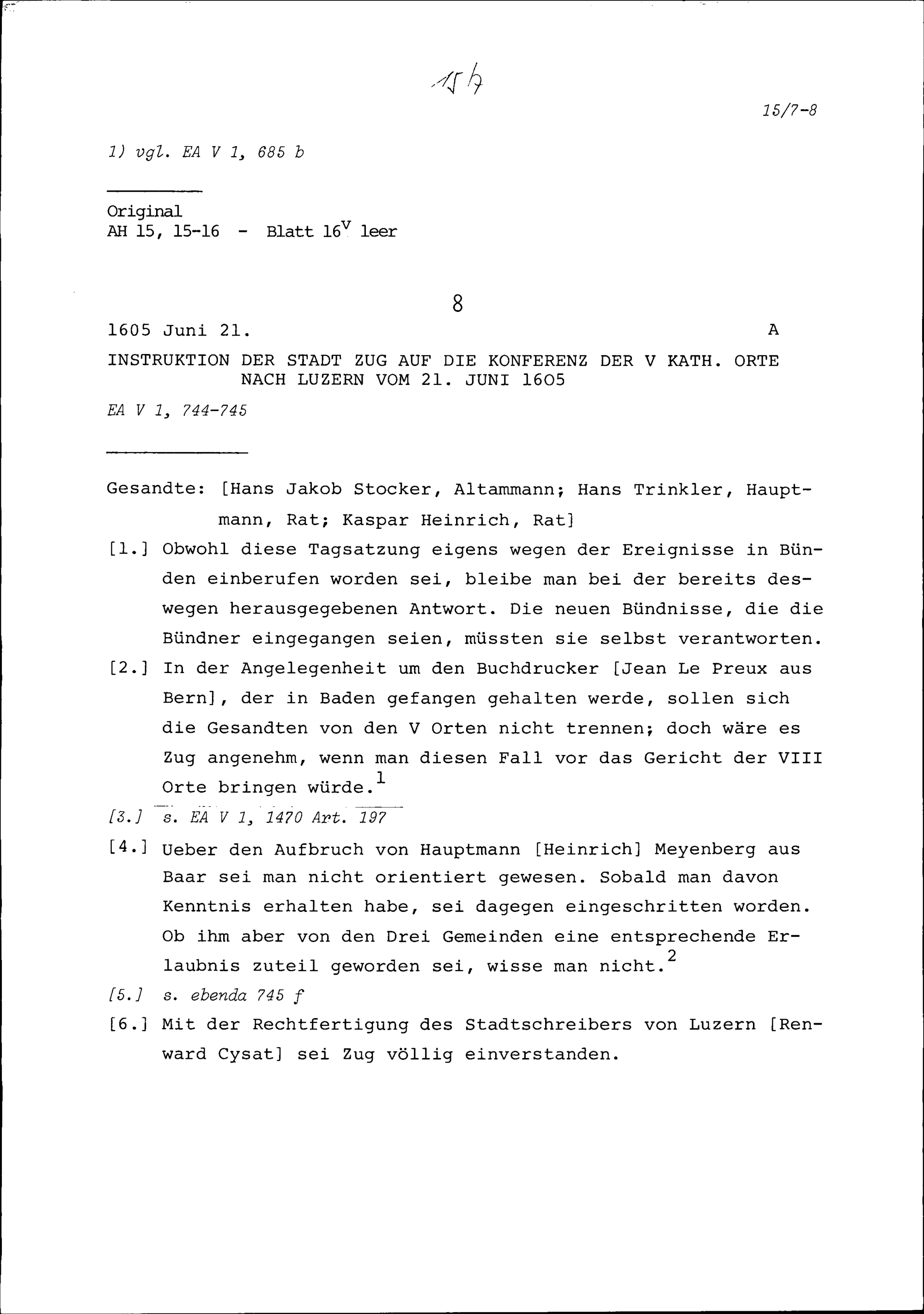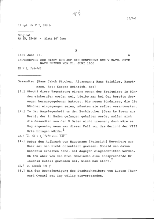 Instruktion der Stadt Zug auf die Konferenz der Fünf Katholischen Orte in Luzern vom 21. Juni 1605