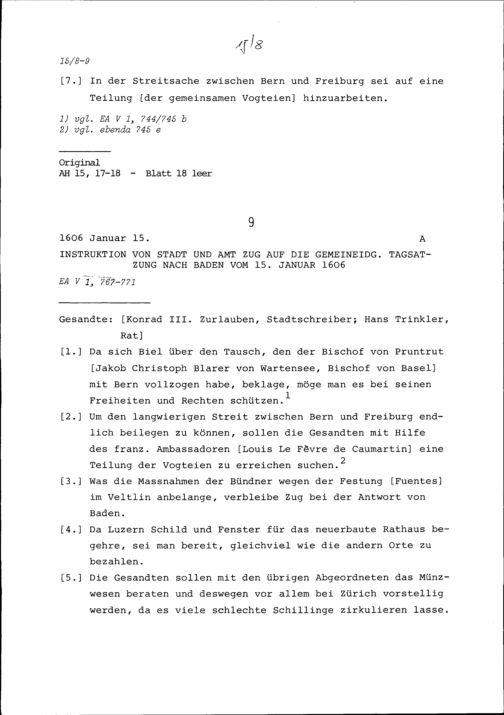 Instruktion von Stadt und Amt Zug auf die Tagsatzung in Baden vom 15. Januar 1606