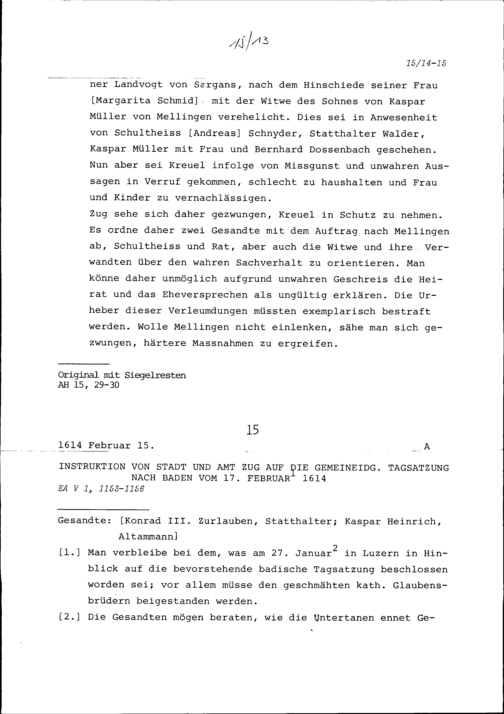 Instruktion von Stadt und Amt Zug auf die Tagsatzung in Baden vom 17. Februar 1614