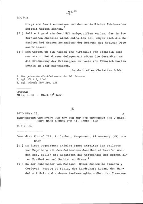 Instruktion von Stadt und Amt Zug auf die Konferenz der Fünf Katholischen Orte in Luzern vom 31. März 1620