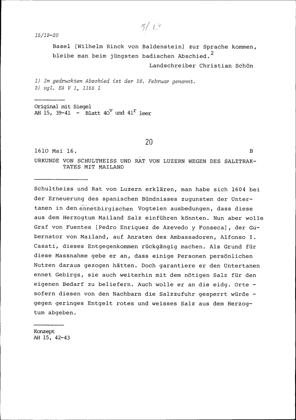 Urkunde des Schultheiss und Rats Luzern wegen des Salztraktates mit Mailand