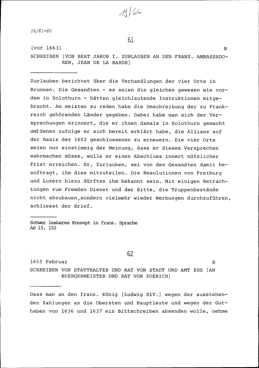 Schreiben von Beat Jakob I. Zurlauben an Jean de la Barde, Ambassador von Frankr...
