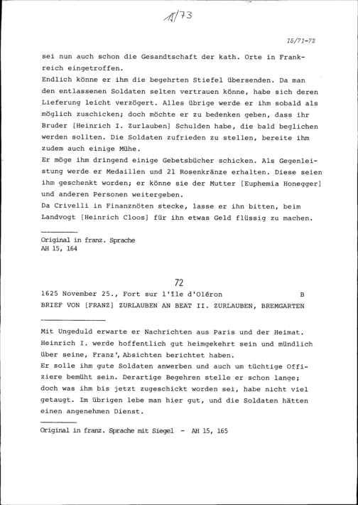 Schreiben von Franz Zurlauben an Beat II. Zurlauben, Bremgarten