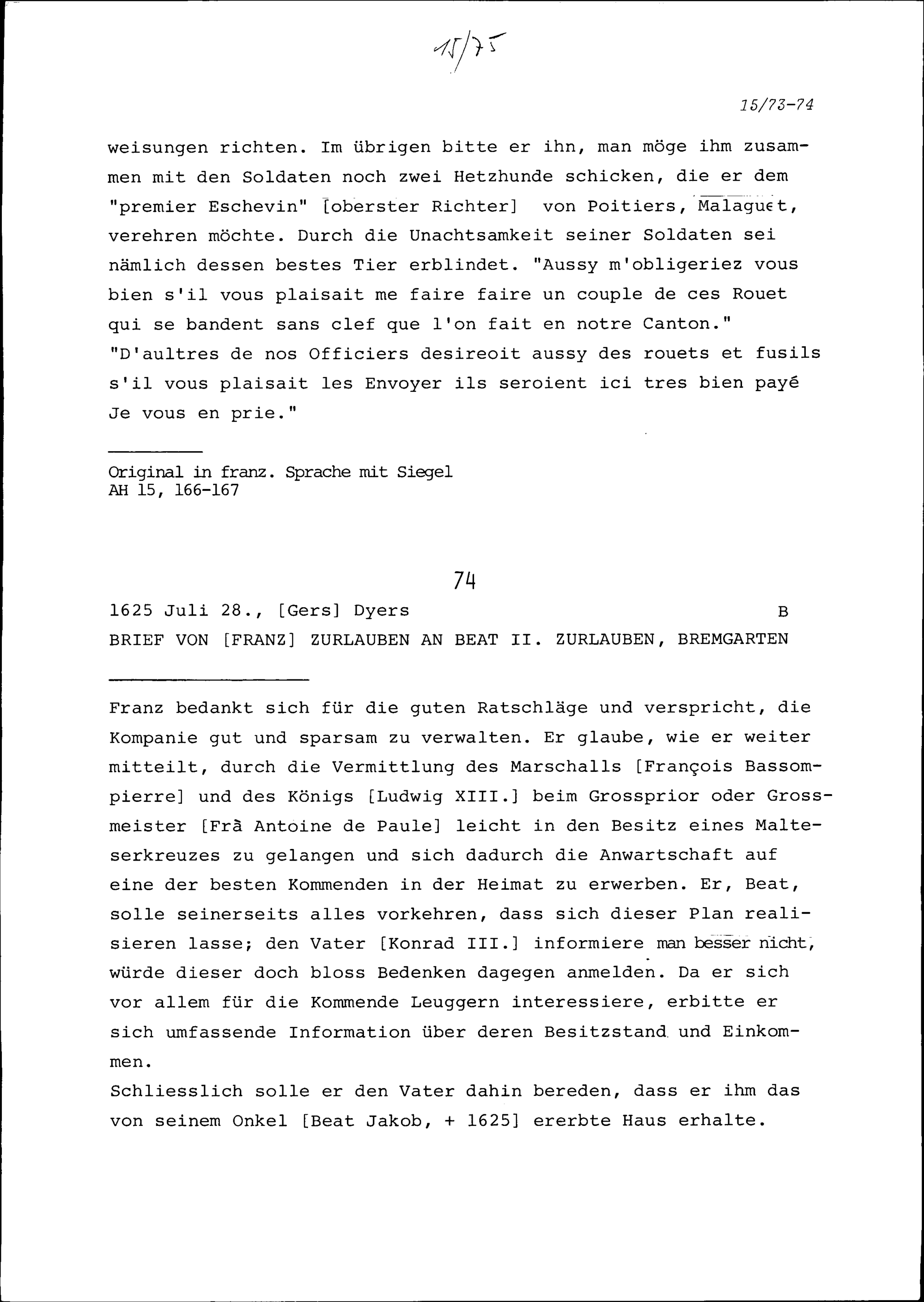 Schreiben von Franz Zurlauben an Beat II. Zurlauben, Bremgarten