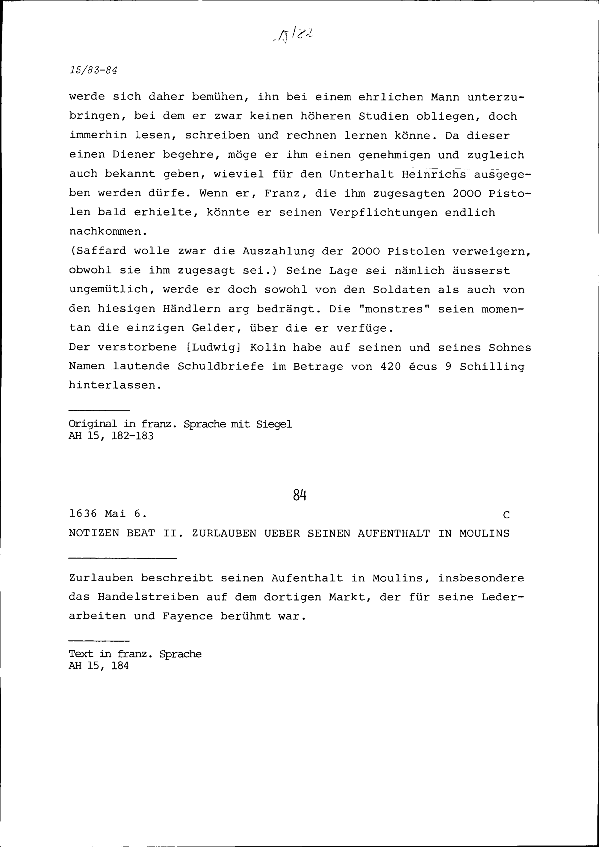 Notiz von Beat II. Zurlauben über seinen Aufenthalt in Moulins
