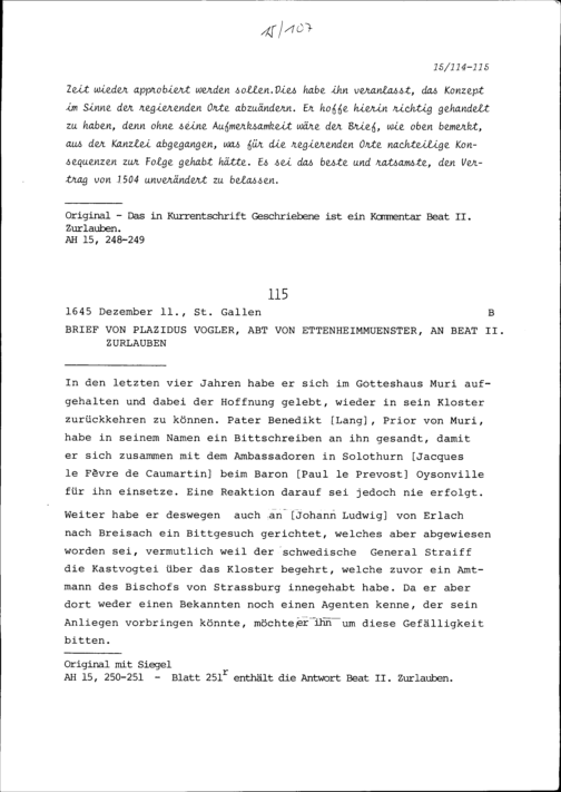 Schreiben von Plazidus Vogler, Abt von Ettenheimmünster, an Beat II. Zurlauben