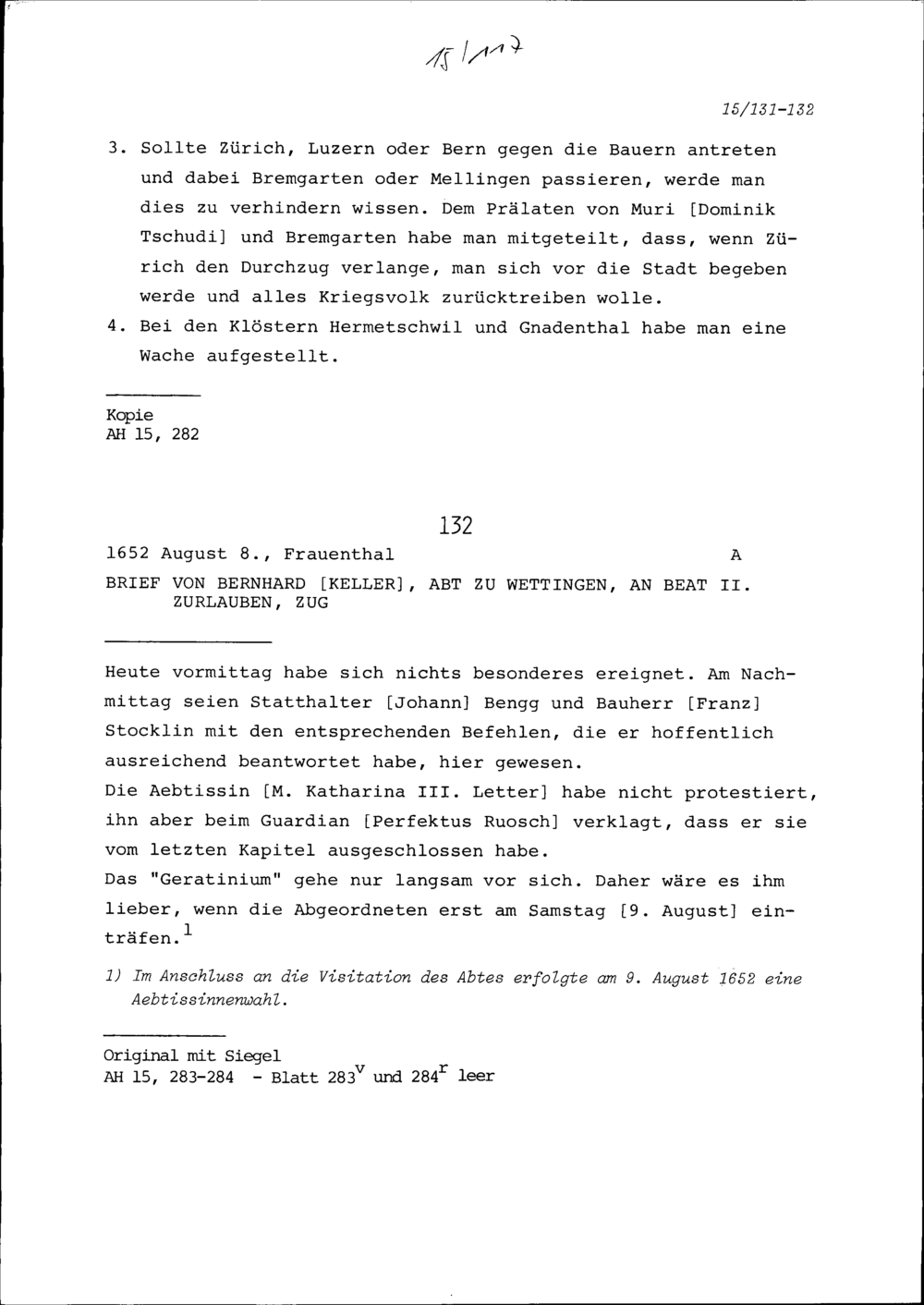 Schreiben von Bernhard Keller, Abt von Wettingen, an Beat II. Zurlauben, Zug