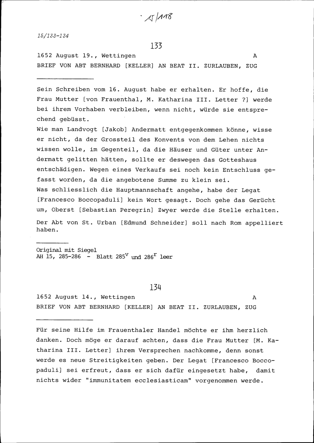 Schreiben von Bernhard Keller, Abt von Wettingen, an Beat II. Zurlauben, Zug