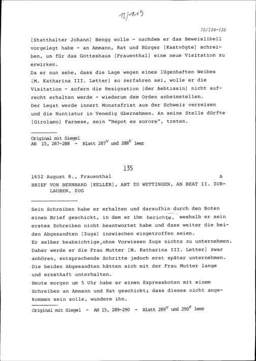 Schreiben von Bernhard Keller, Abt von Wettingen, an Beat II. Zurlauben, Zug