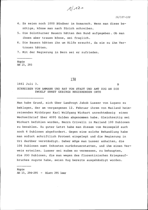 Schreiben des Ammanns und Rats von Stadt und Amt Zug an die Zwölf die Ennetbirgischen...