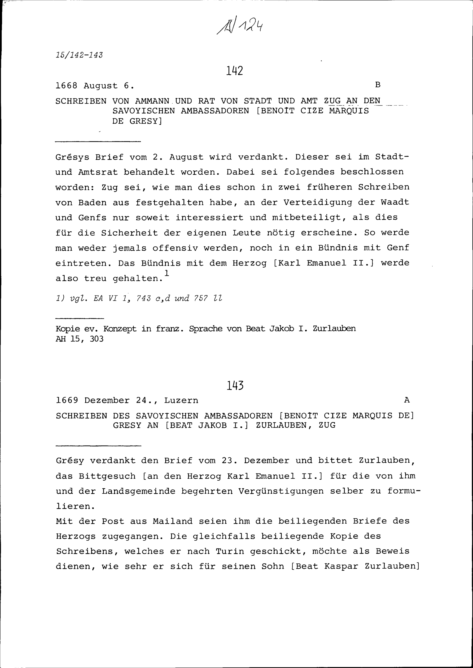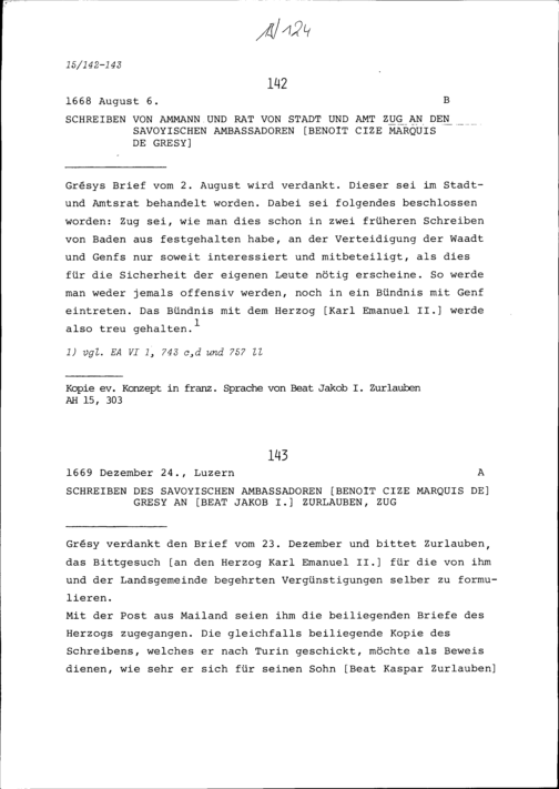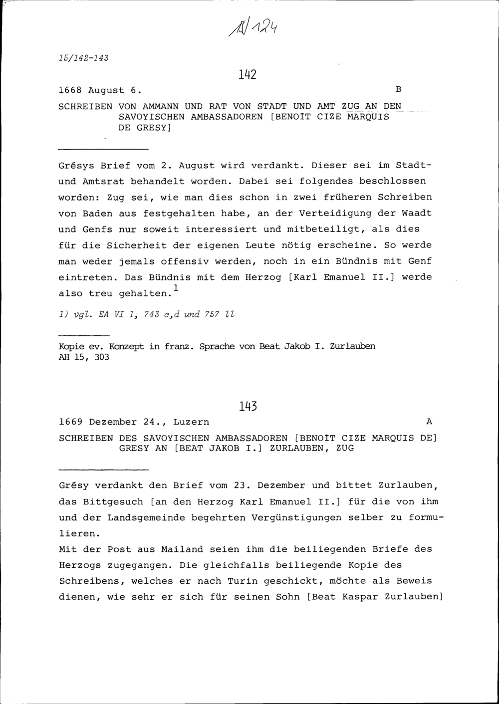 Schreiben des Ammanns und Rats von Stadt und Amt Zug an Benoît II. Cize Marquis de Grésy, Ambassador von Savoyen
