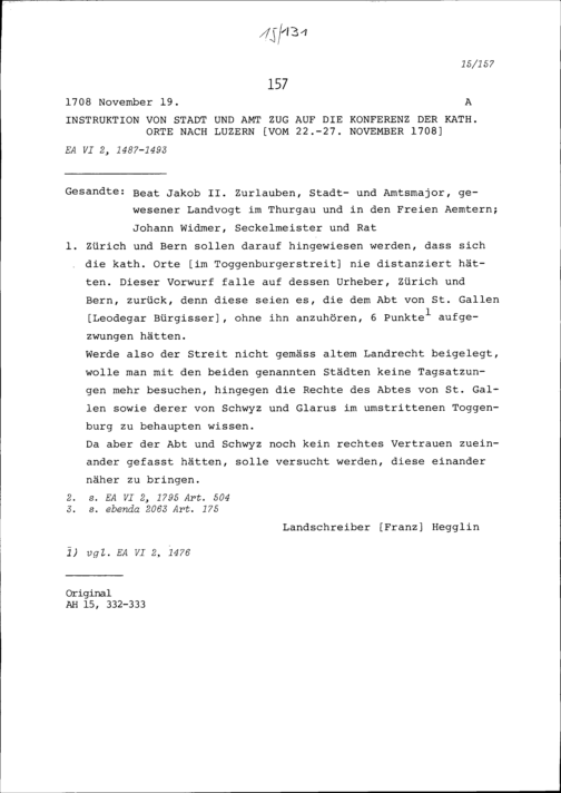 Instruktion von Stadt und Amt Zug auf die Konferenz der Katholischen Orte in Luzern vom 22. bis 27. November 1708