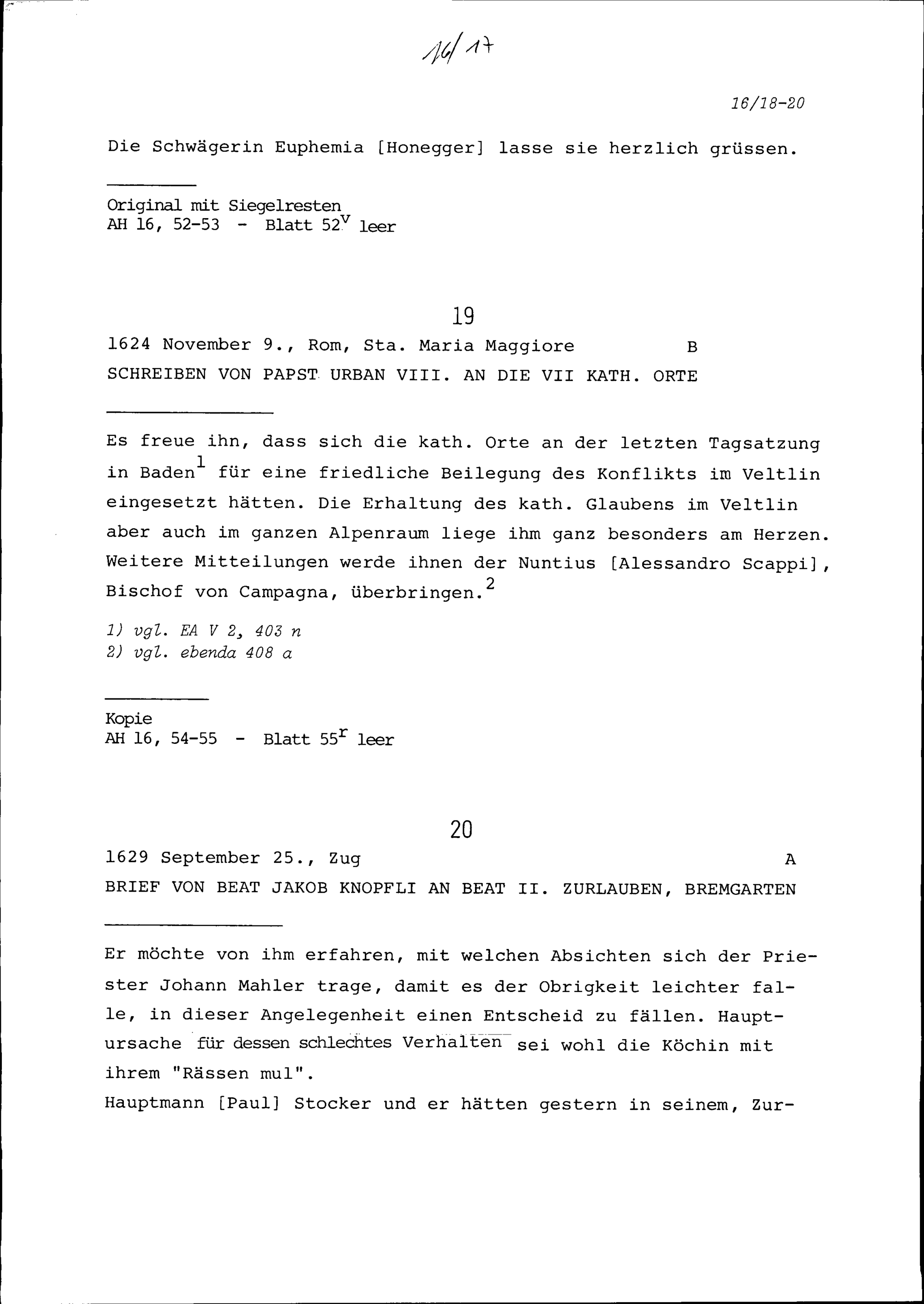 Schreiben von Urban VIII., Papst, an die Sieben Katholischen Orte