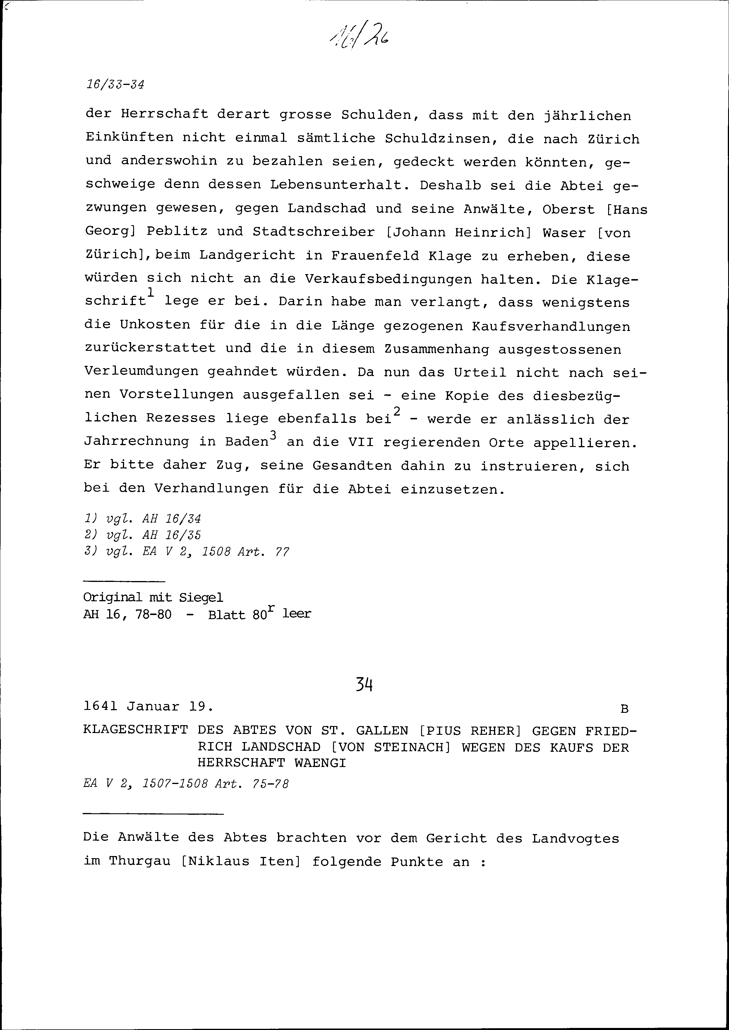 Klageschrift von Pius Reher, Abt von Sankt Gallen, gegen Friedrich Landschad von Steinach wegen des Kaufs der Herrschaft Wängi