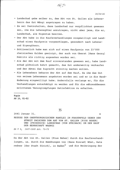 Rezess der Oberthurgauischen Kanzlei in Frauenfeld über den Streit zwischen Pius Reher, Abt von Sankt Gallen, und Friedrich Landschad von Steinach um den Kauf der Herrschaft Wängi