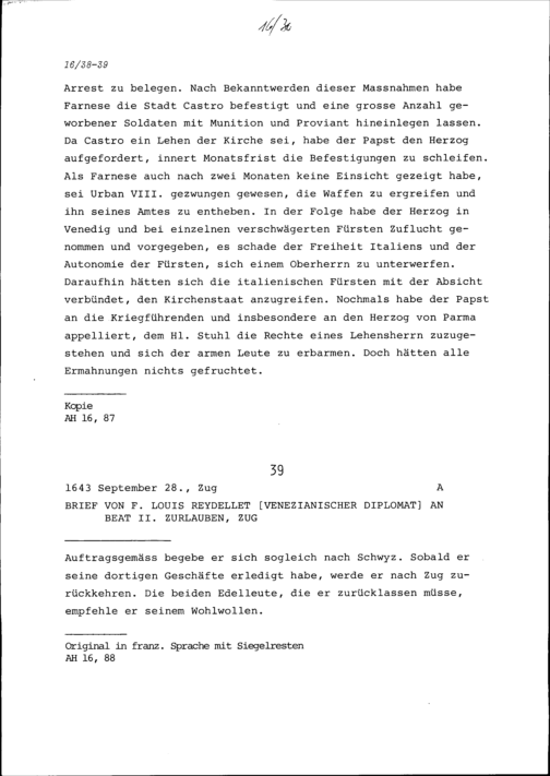 Schreiben von F. Louis Reydellet, venezianischer Diplomat, an Beat II. Zurlauben, Zug