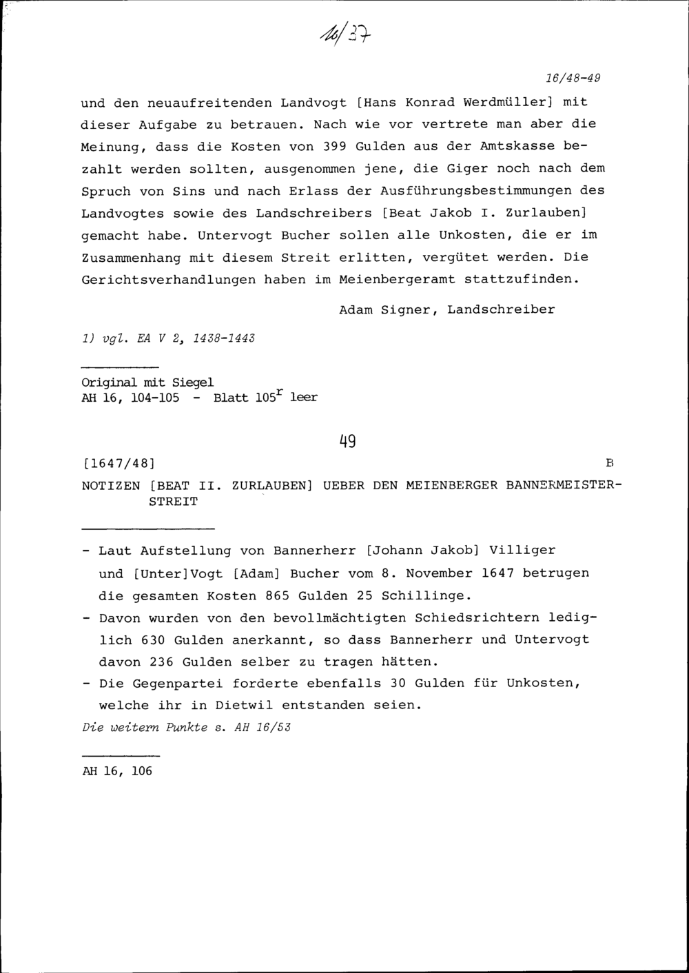 Notiz von Beat II. Zurlauben über den Meienberger Bannermeisterstreit