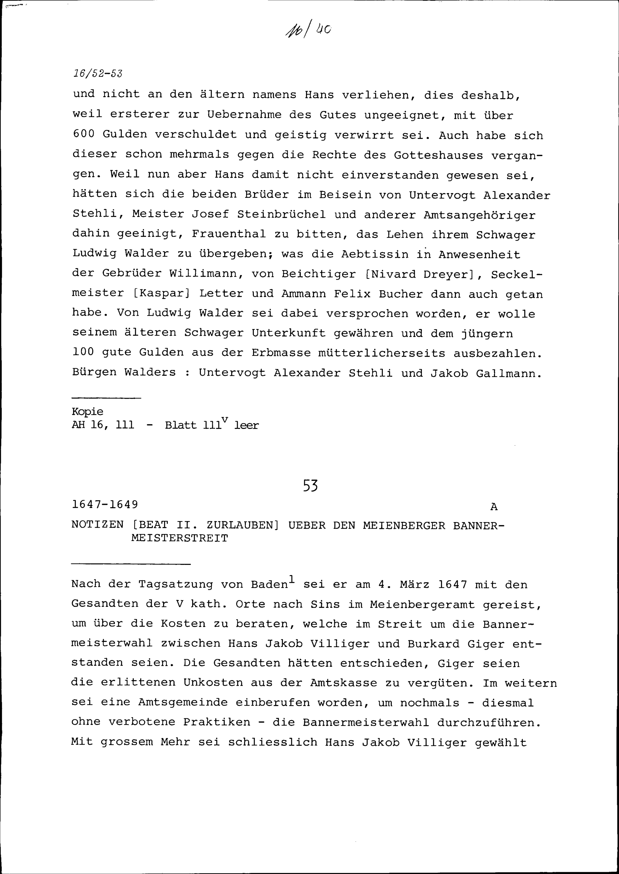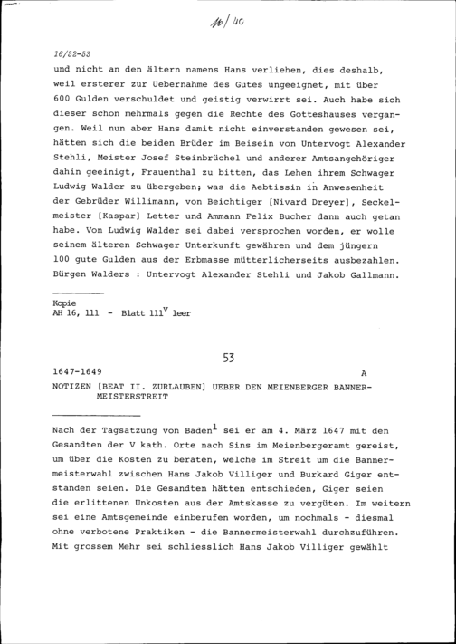 Notiz von Beat II. Zurlauben über den Meienberger Bannermeisterstreit