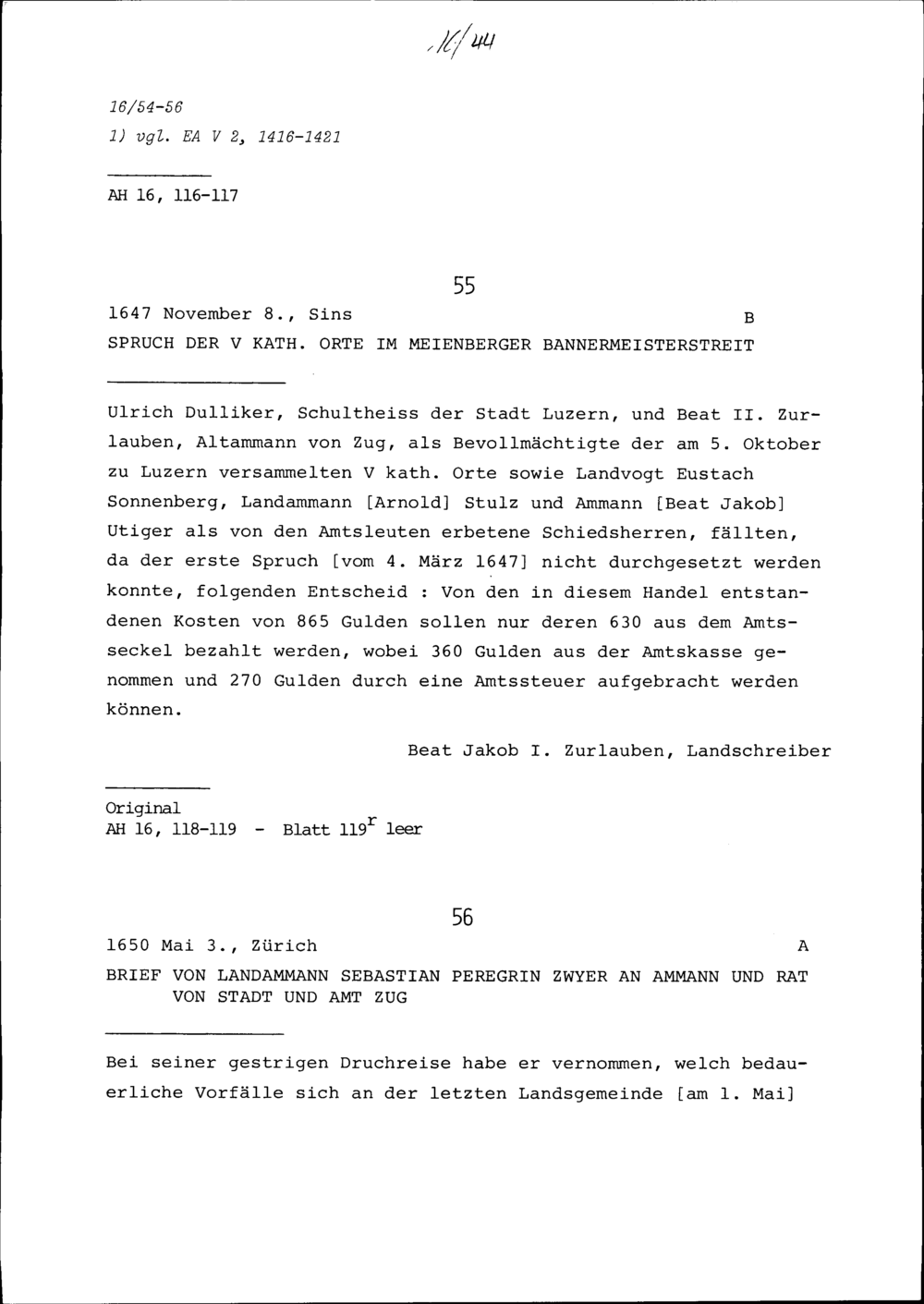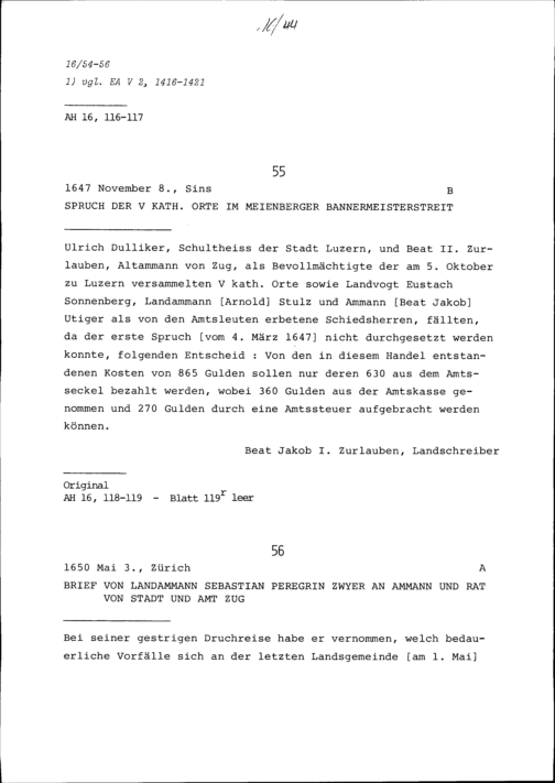 Spruch der Fünf Katholischen Orte im Meienberger Bannermeisterstreit