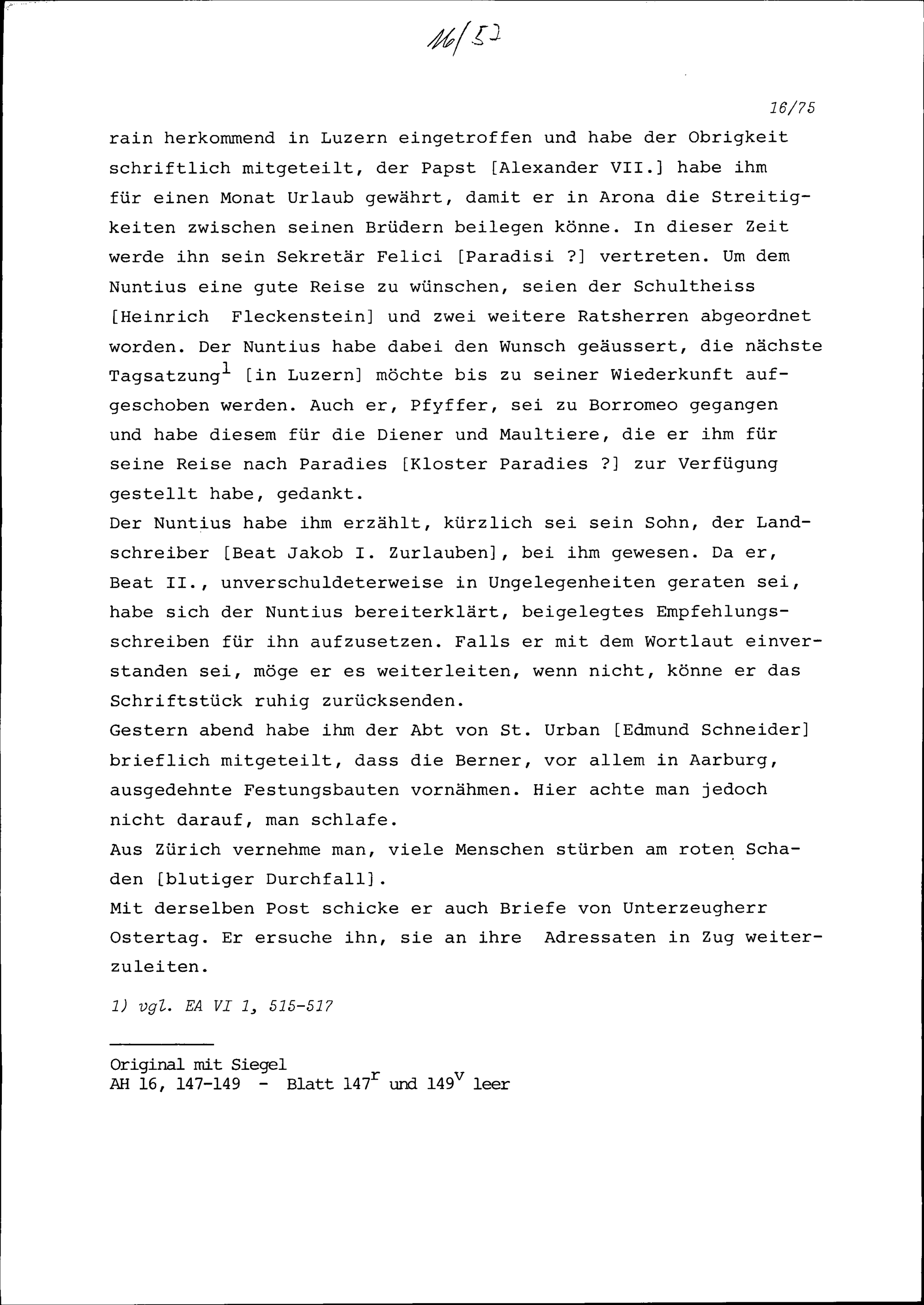 Schreiben von Kaspar Pfyffer an Beat II. Zurlauben, Zug