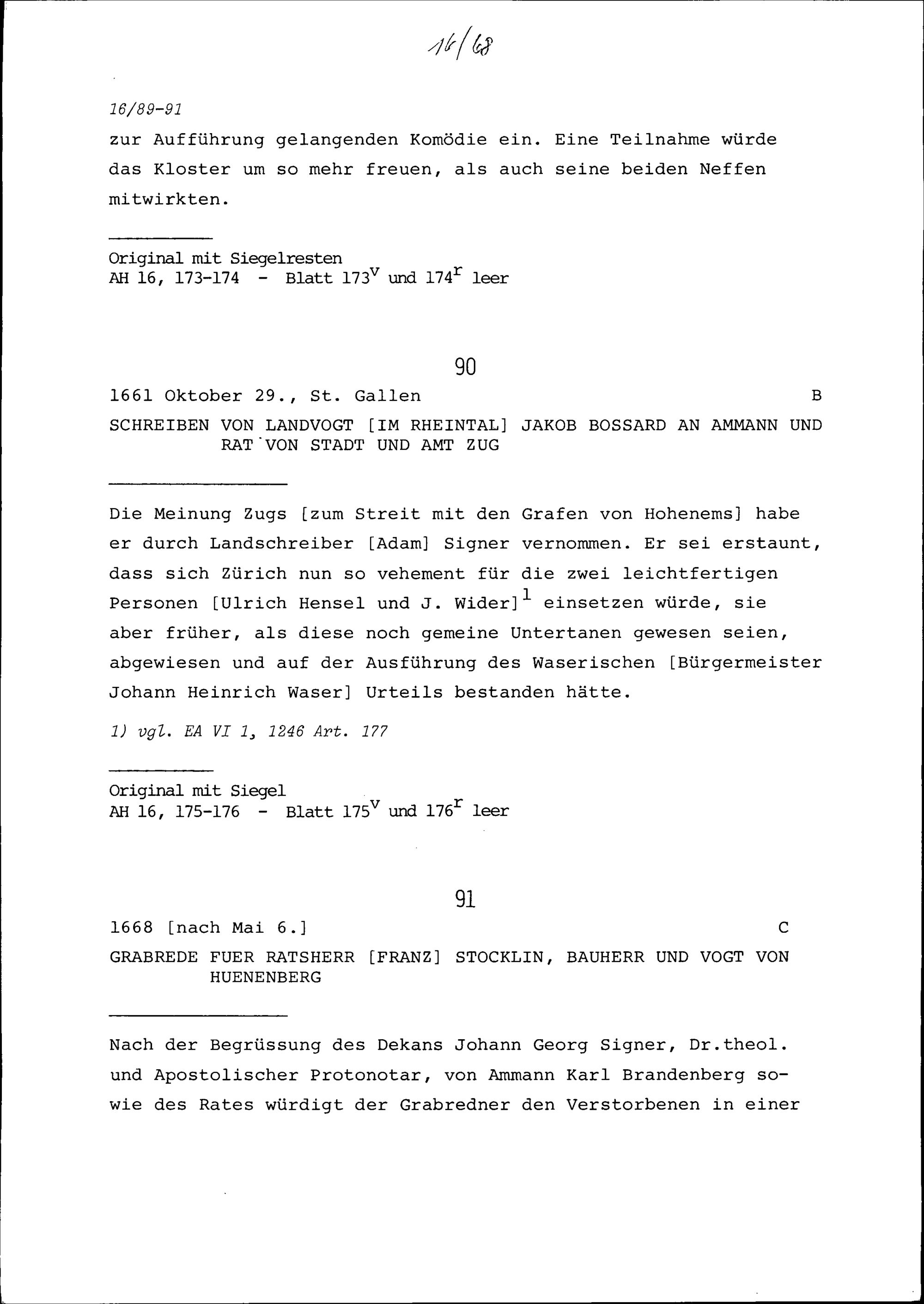 Schreiben von Jakob Bossard, Landvogt im Rheintal, an Ammann und Rat von Stadt und Amt Zug