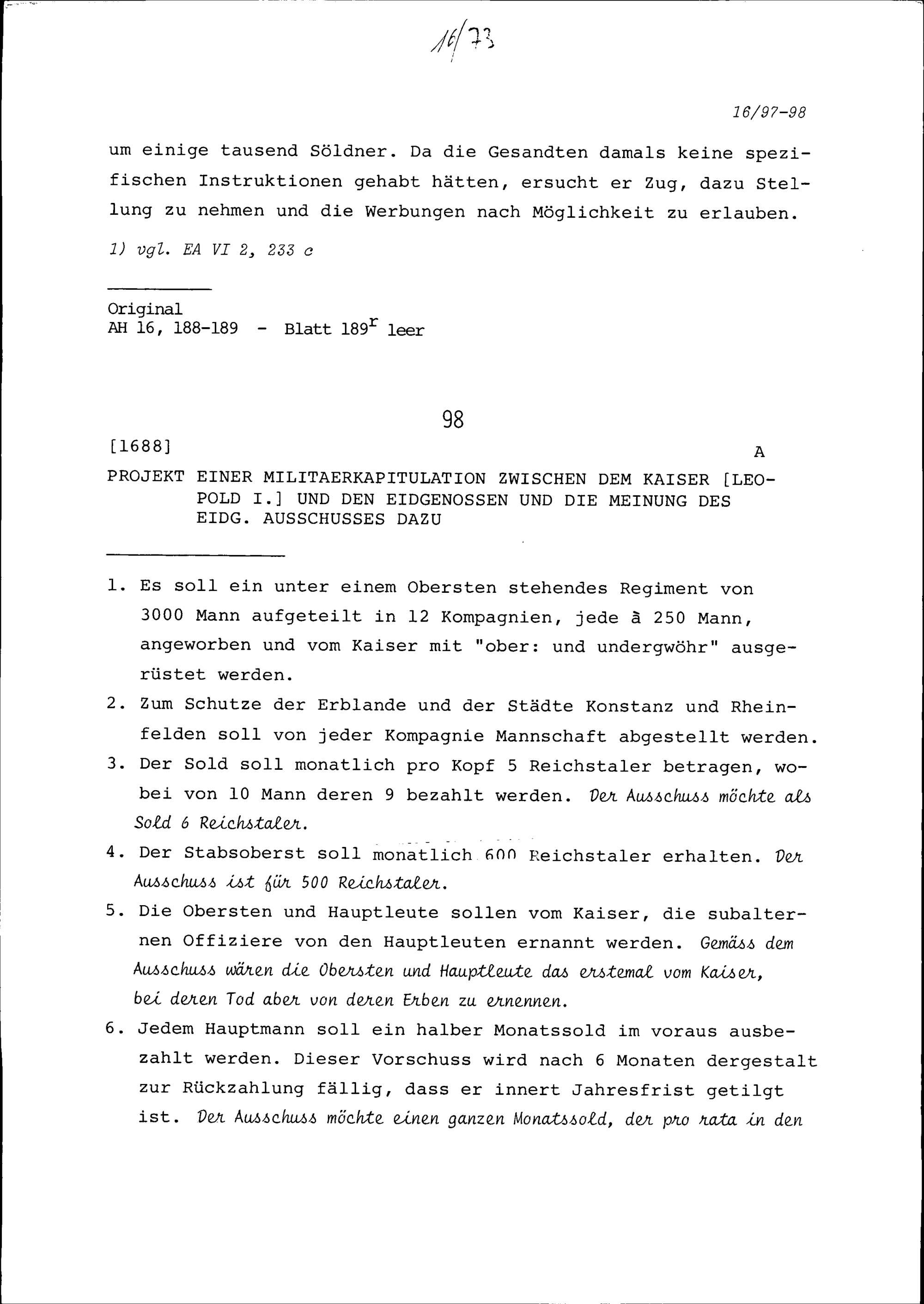 Projekt einer Militärkapitulation zwischen Leopold I., Kaiser des Heiligen Römischen Reiches, und den Eidgenossen und die Meinung des eidgenössischen Ausschusses dazu