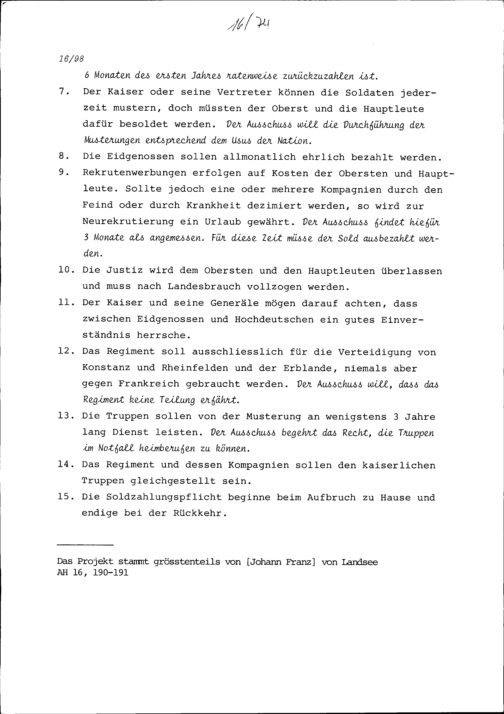 Projekt einer Militärkapitulation zwischen Leopold I., Kaiser des Heiligen Römischen Reiches, und den Eidgenossen und die Meinung des eidgenössischen Ausschusses dazu