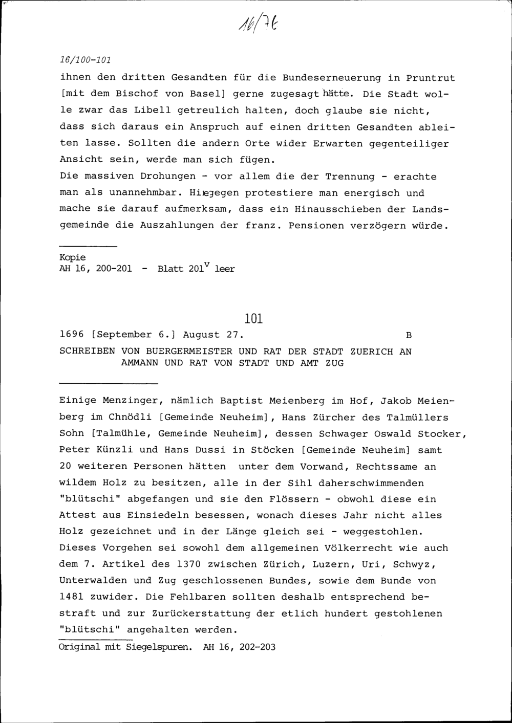 Schreiben des Bürgermeisters und Rats der Stadt Zürich an Ammann und Rat von Stadt...