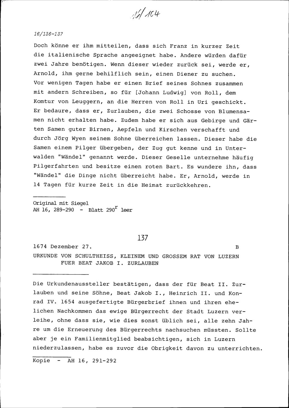 Urkunde des Schultheiss, Kleinen und Grossen Rats von Luzern für Beat Jakob I. Z...