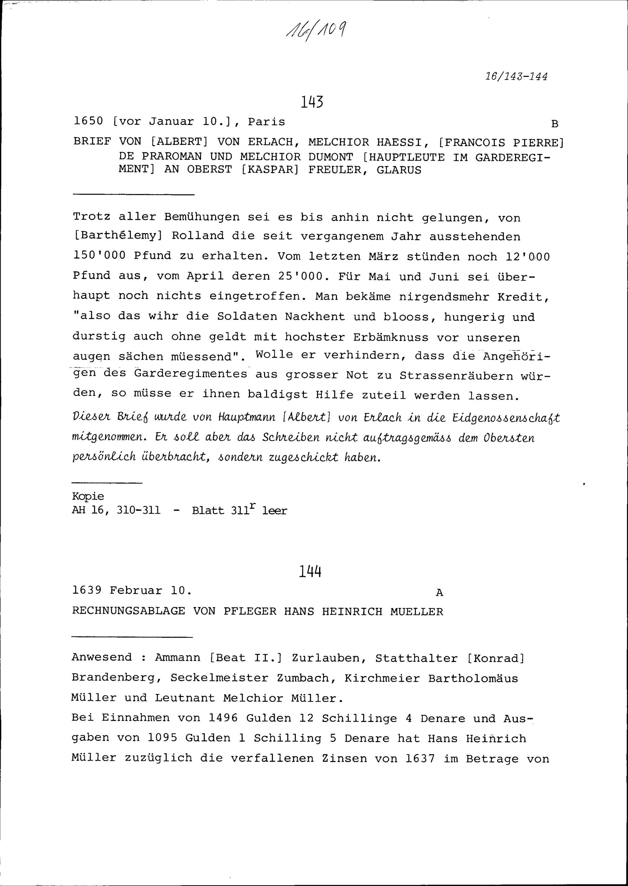 Schreiben von Albert von Erlach, von Melchior Hässi, von François Pierre de Praroman...