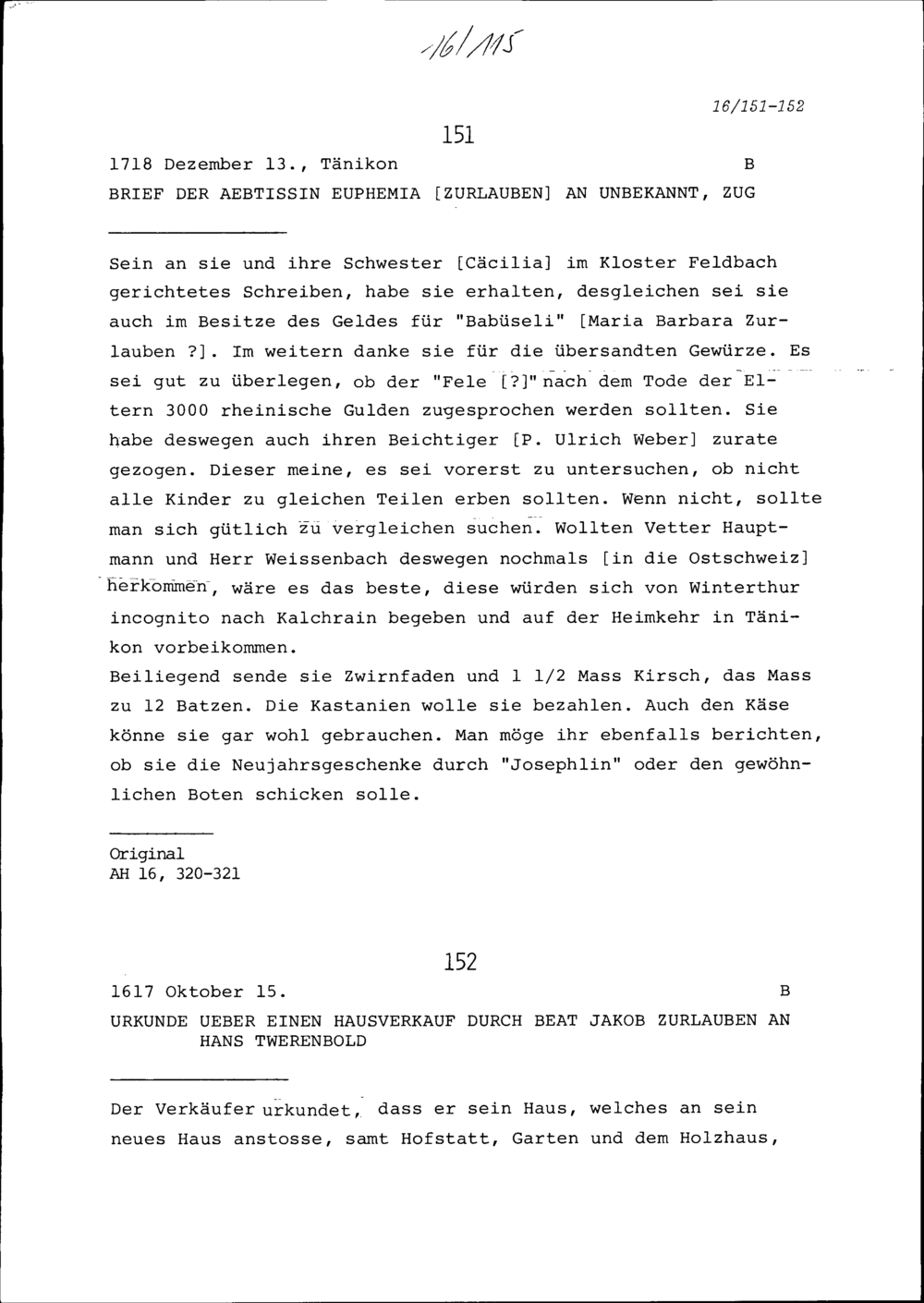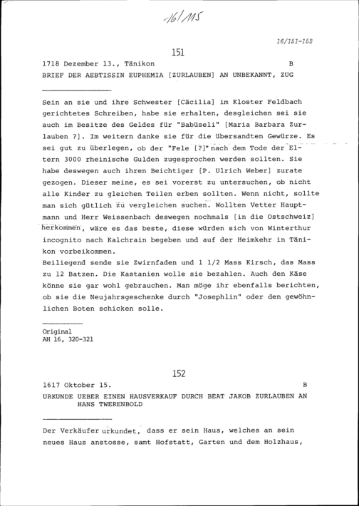 Schreiben von Euphemia Zurlauben, Äbtissin, an Unbekannt, Zug