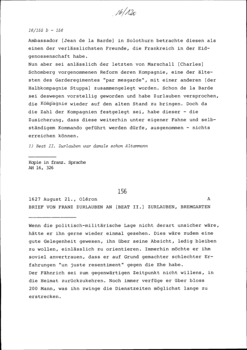 Schreiben von Franz Zurlauben an Beat II. Zurlauben, Bremgarten