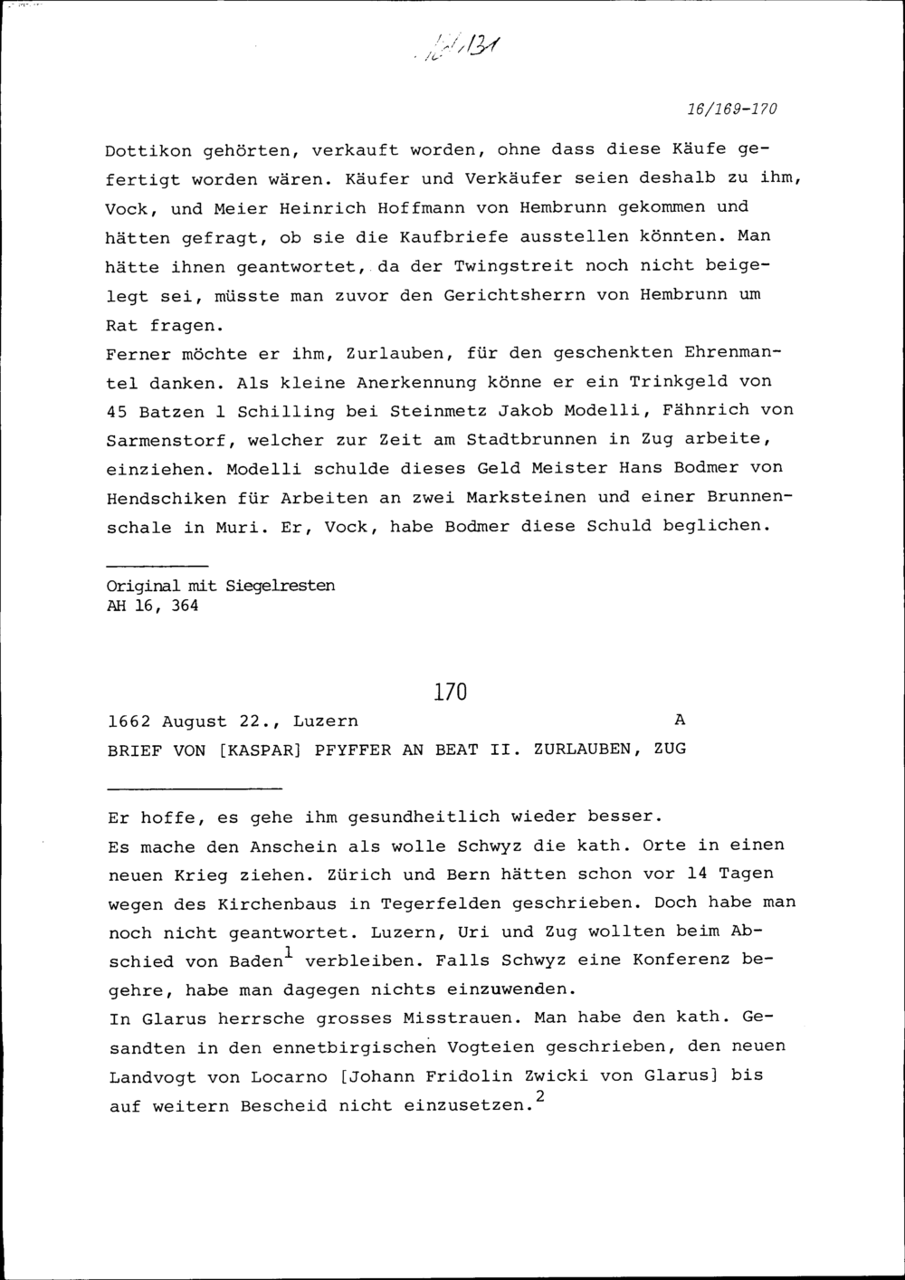 Schreiben von Kaspar Pfyffer an Beat II. Zurlauben, Zug