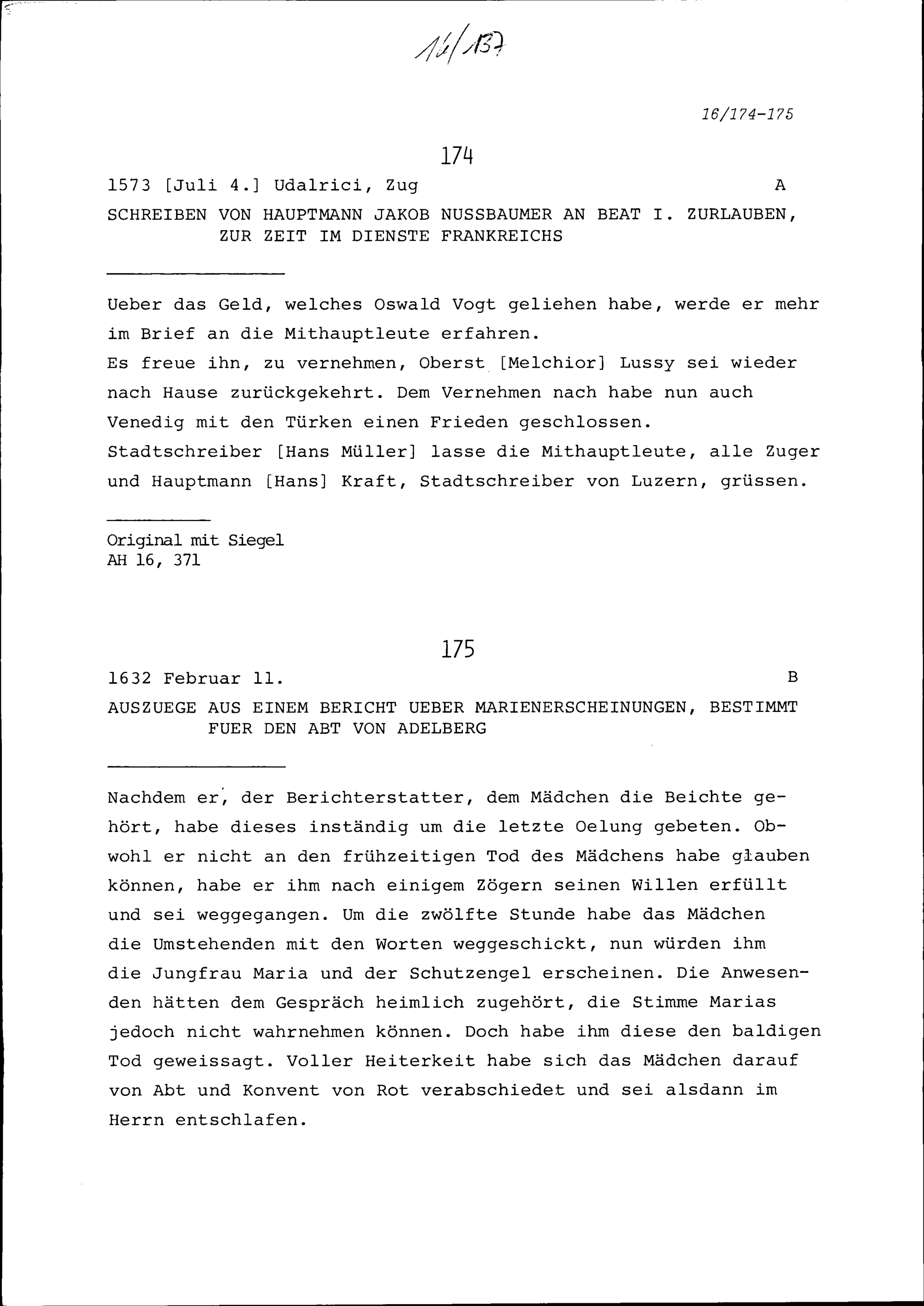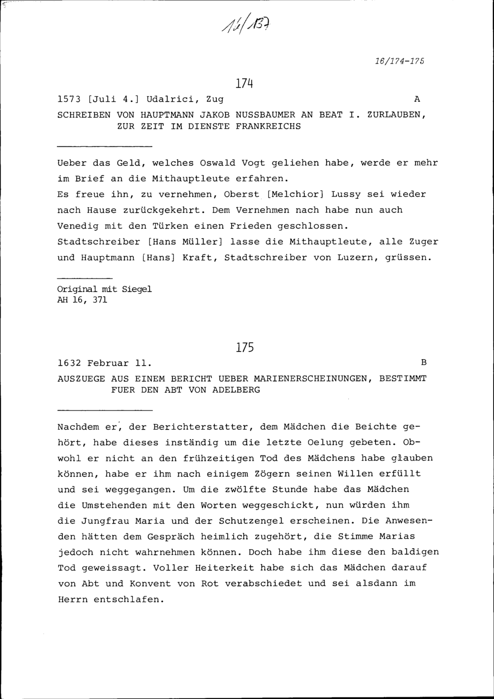 Schreiben von Jakob Nussbaumer, Hauptmann, an Beat I. Zurlauben, zur Zeit im Dienste Frankreichs