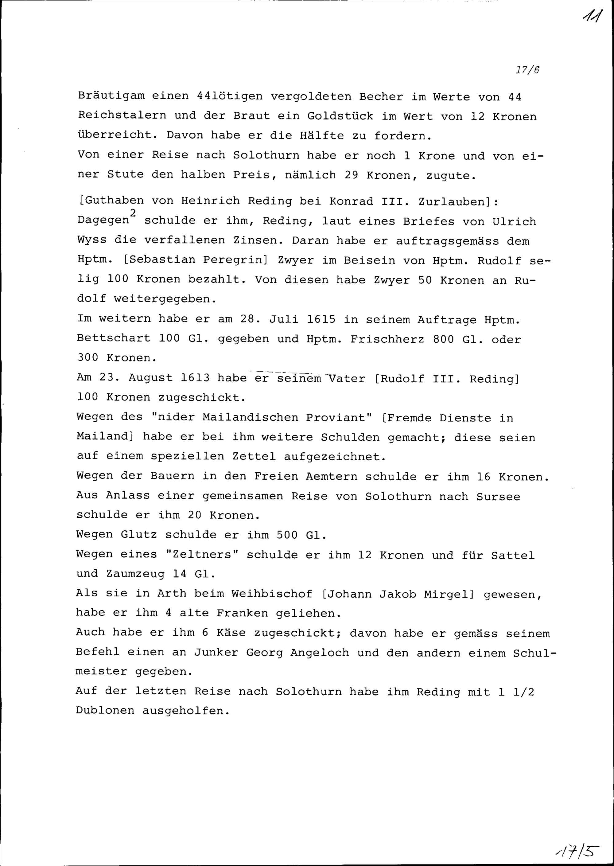 Rechnungen von Konrad III. Zurlauben gegenüber Heinrich Reding, Landammann, und ...