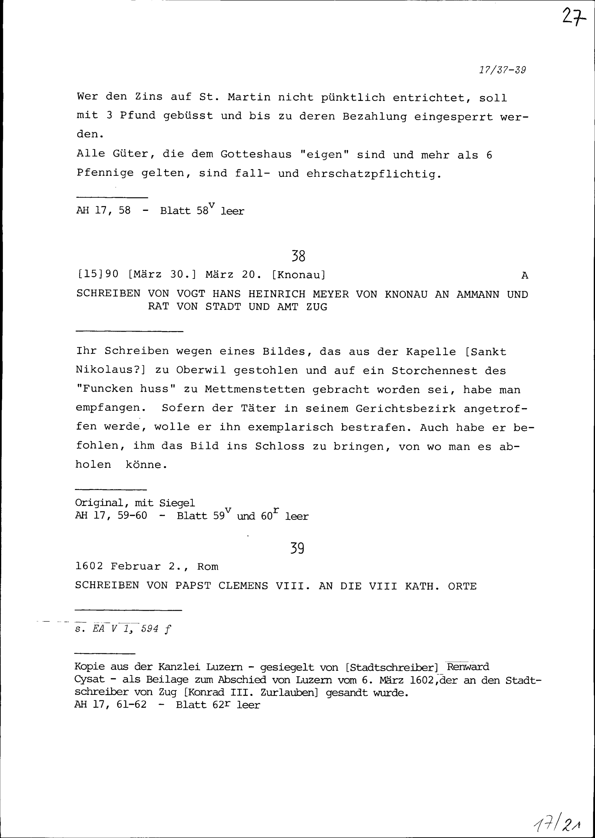 Schreiben von Hans Heinrich Meyer von Knonau, Vogt, an Ammann und Rat von Stadt und Amt Zug