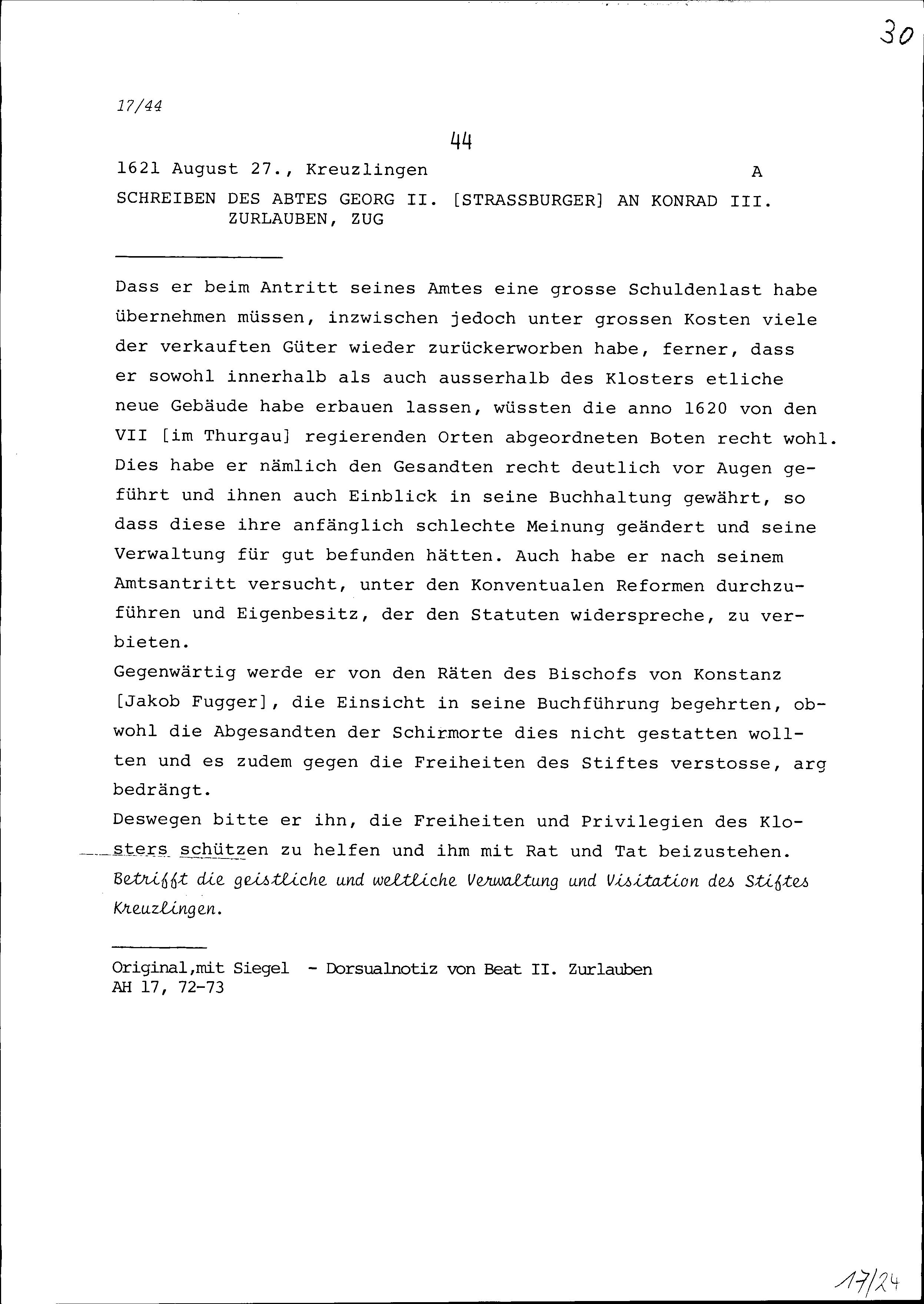 Schreiben von Georg II. Strassburger, Abt, an Konrad III. Zurlauben, Zug