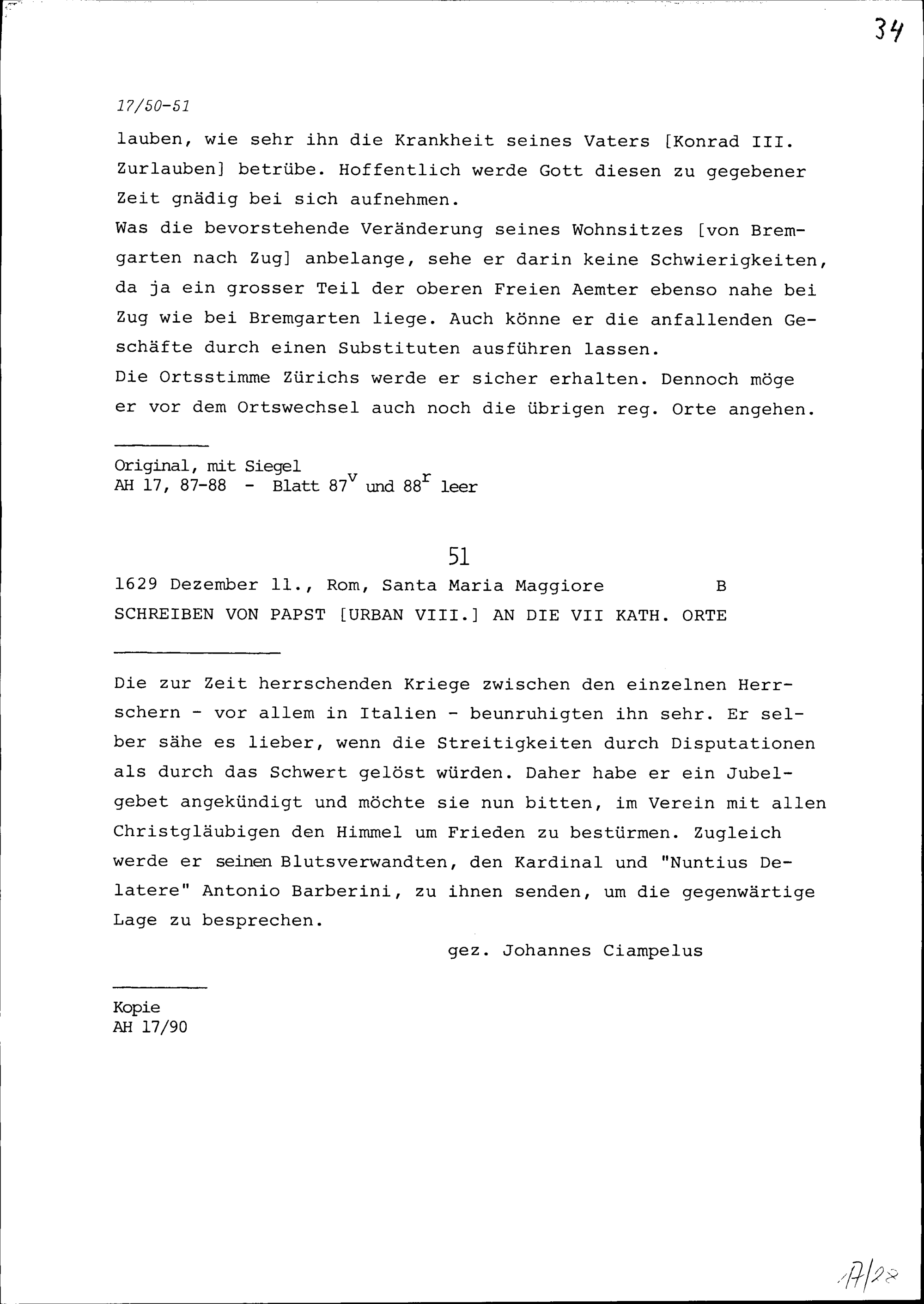 Schreiben von Urban VIII., Papst, an die Sieben Katholischen Orte