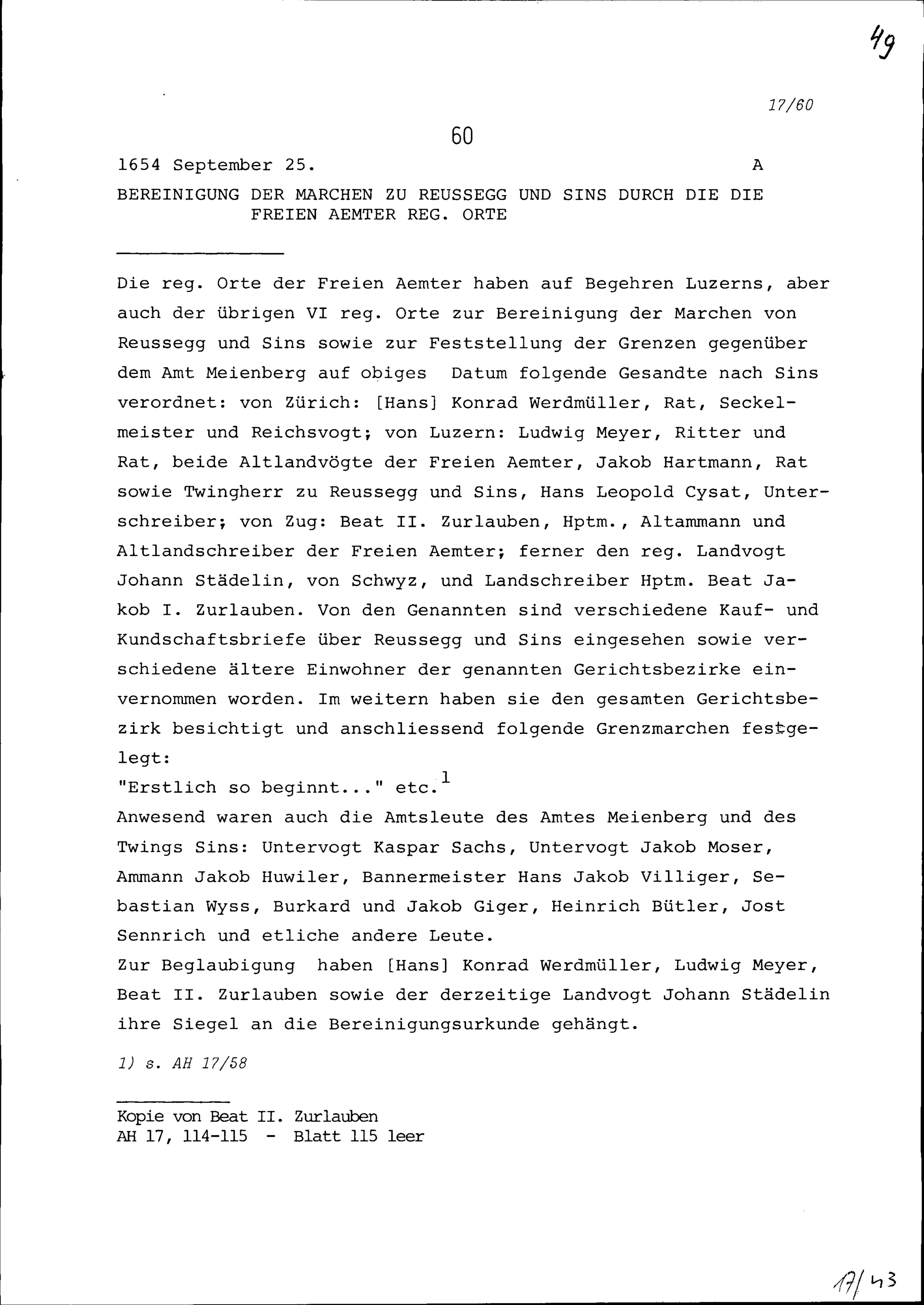 Bereinigung der March zu Reussegg und Sins durch die die Freien Ämter regierenden...