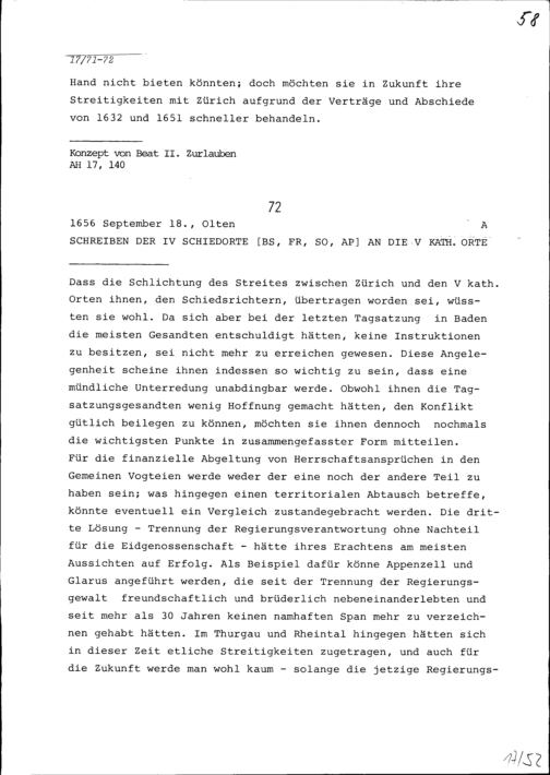 Schreiben der Vier Schiedsorte Basel, Freiburg, Solothurn und Appenzell an die Fünf Katholischen Orte