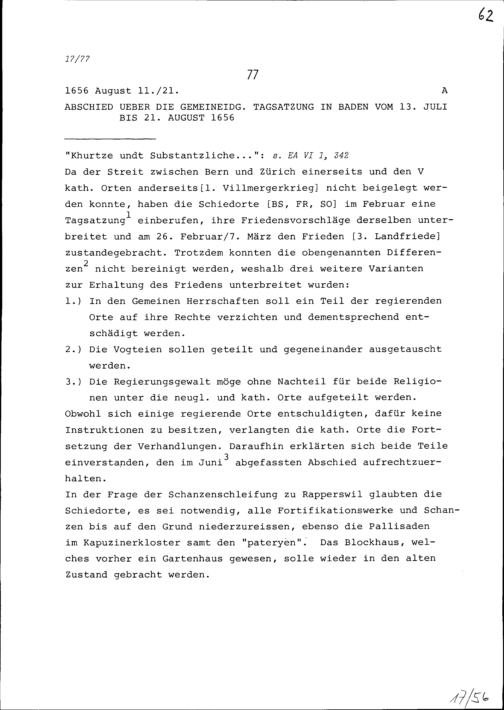 Abschied der Tagsatzung in Baden vom 13. Juli bis 21. August 1656