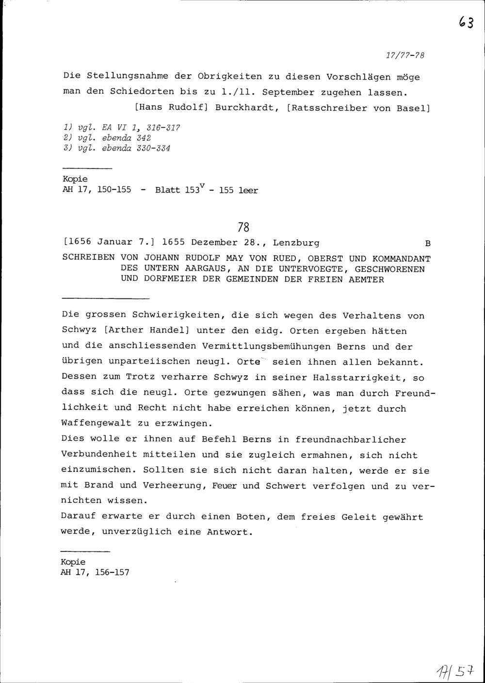 Schreiben von Johann Rudolf May von Rüd, Oberst und Kommandant des unteren Aargaus,...