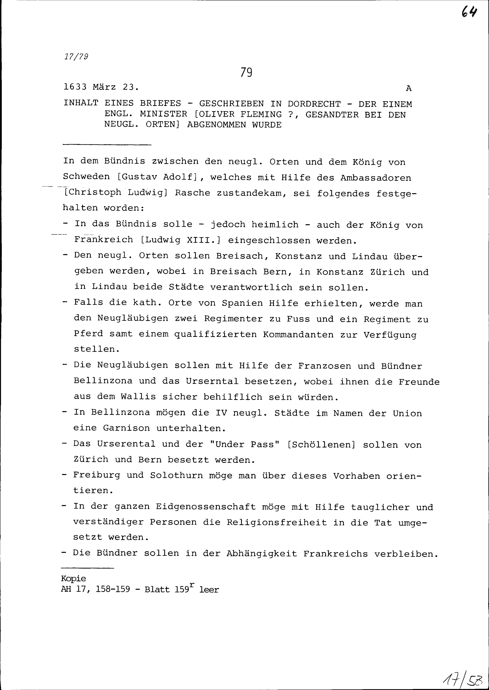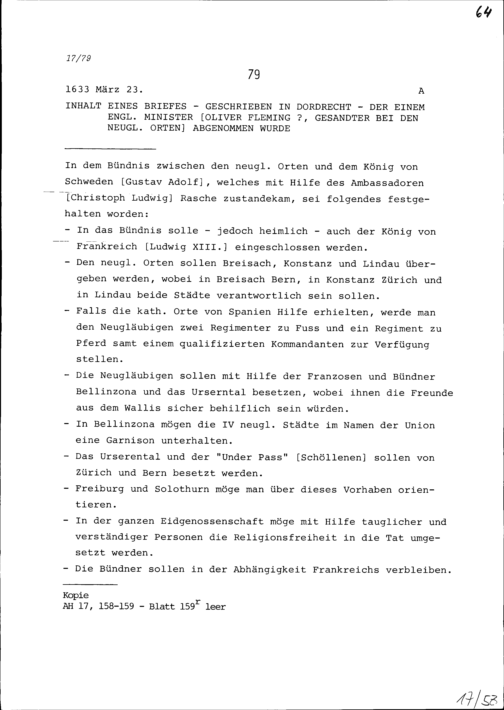Inhalt eines Schreibens, geschrieben in Dordrecht, von Olivier Fleming, englischer Minister und Gesandter bei den Neugläubigen Orten, abgenommen wurde