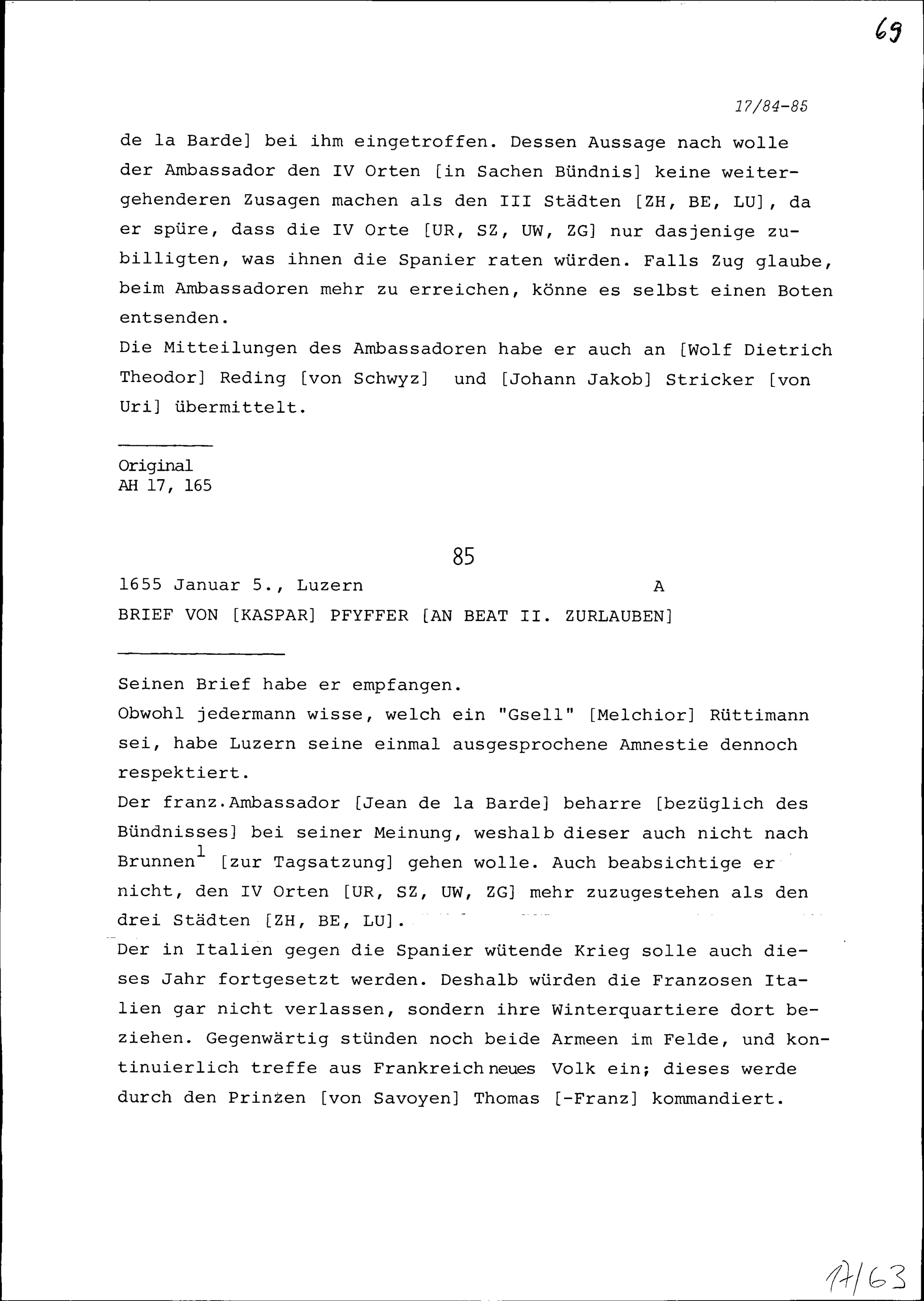 Schreiben von Kaspar Pfyffer an Beat II. Zurlauben