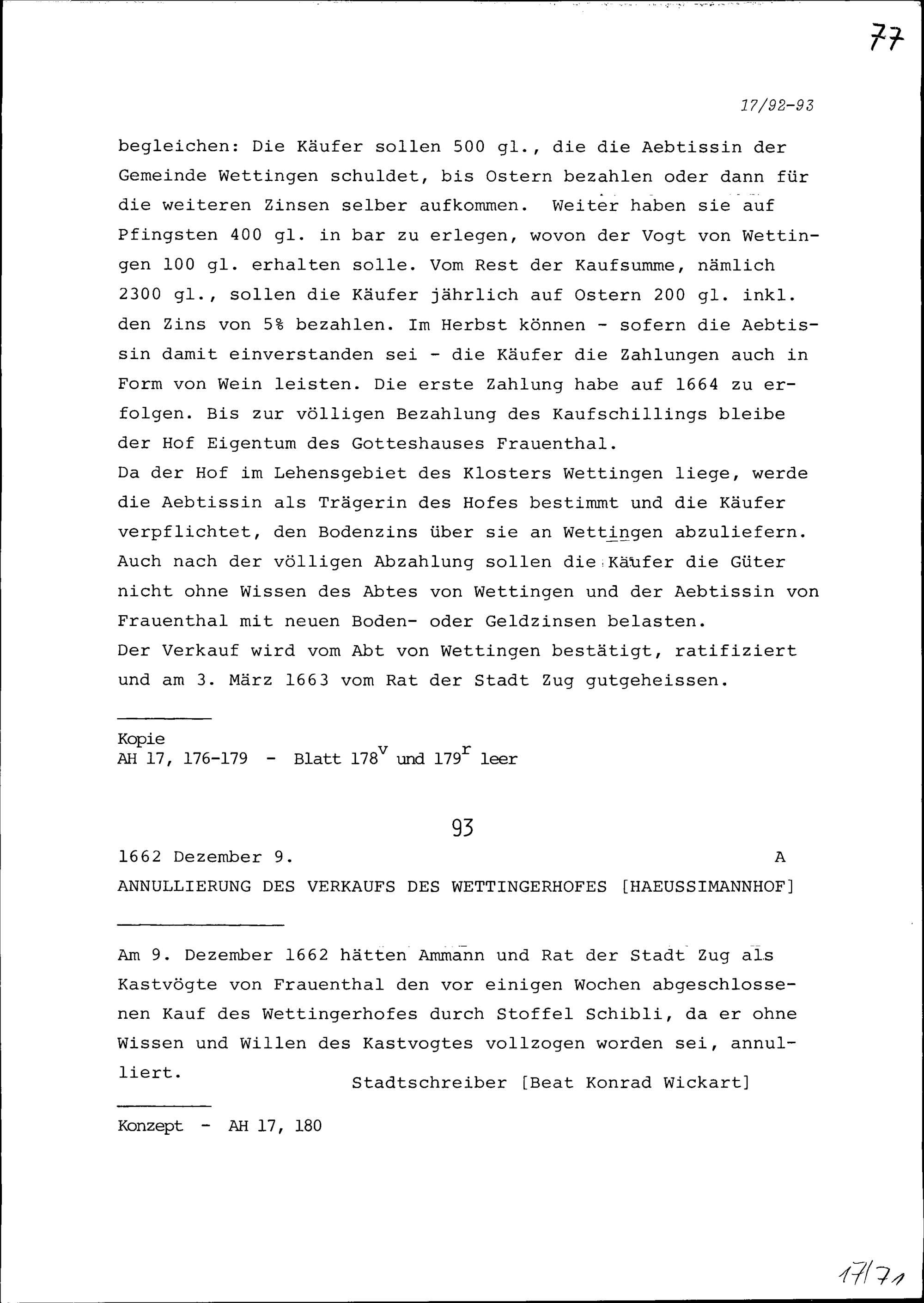 Annullierung des Verkaufs des Wettingerhofs (= Häusimannhof)