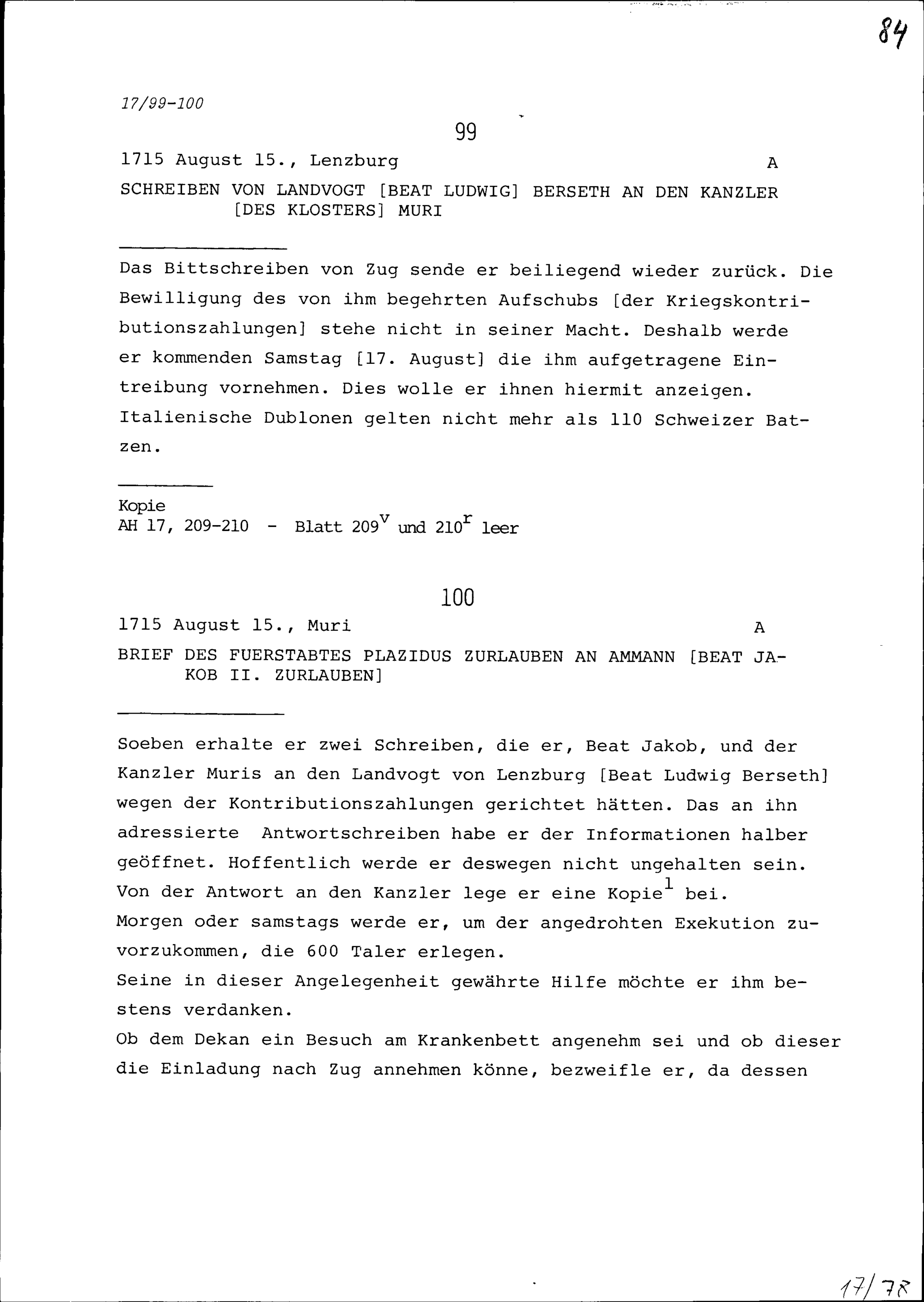 Schreiben von Beat Ludwig Berseth, Landvogt, an den Kanzler des Klosters Muri