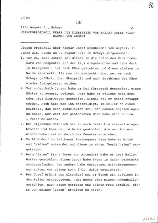 Verhörprotokoll über die Diebereien von Kaspar Josef Nussbaumer von Ägeri