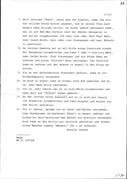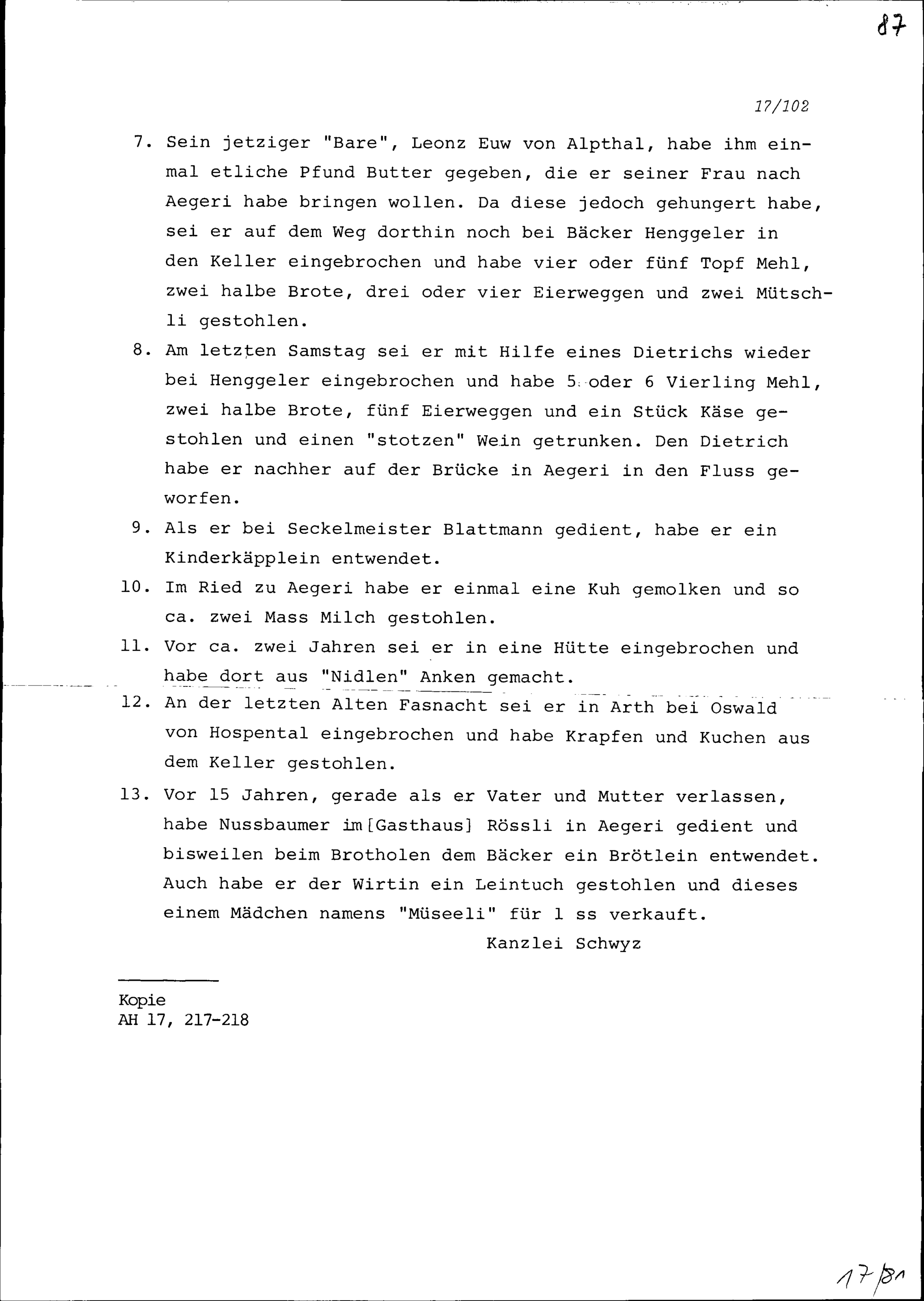 Verhörprotokoll über die Diebereien von Kaspar Josef Nussbaumer von Ägeri